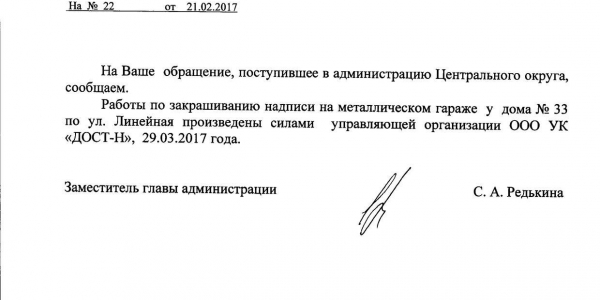 Номер жалобы:14565 Тип жалобы:Иные проблемы ЖКХ Название объекта:Управляющая Компания Город:Новосибирск Адрес:Новосибирск, улица Линейная, 33/1 Описание жалобы:Рядом гаражи на которых разные надписи Статус: