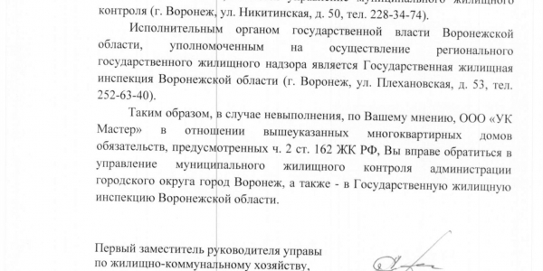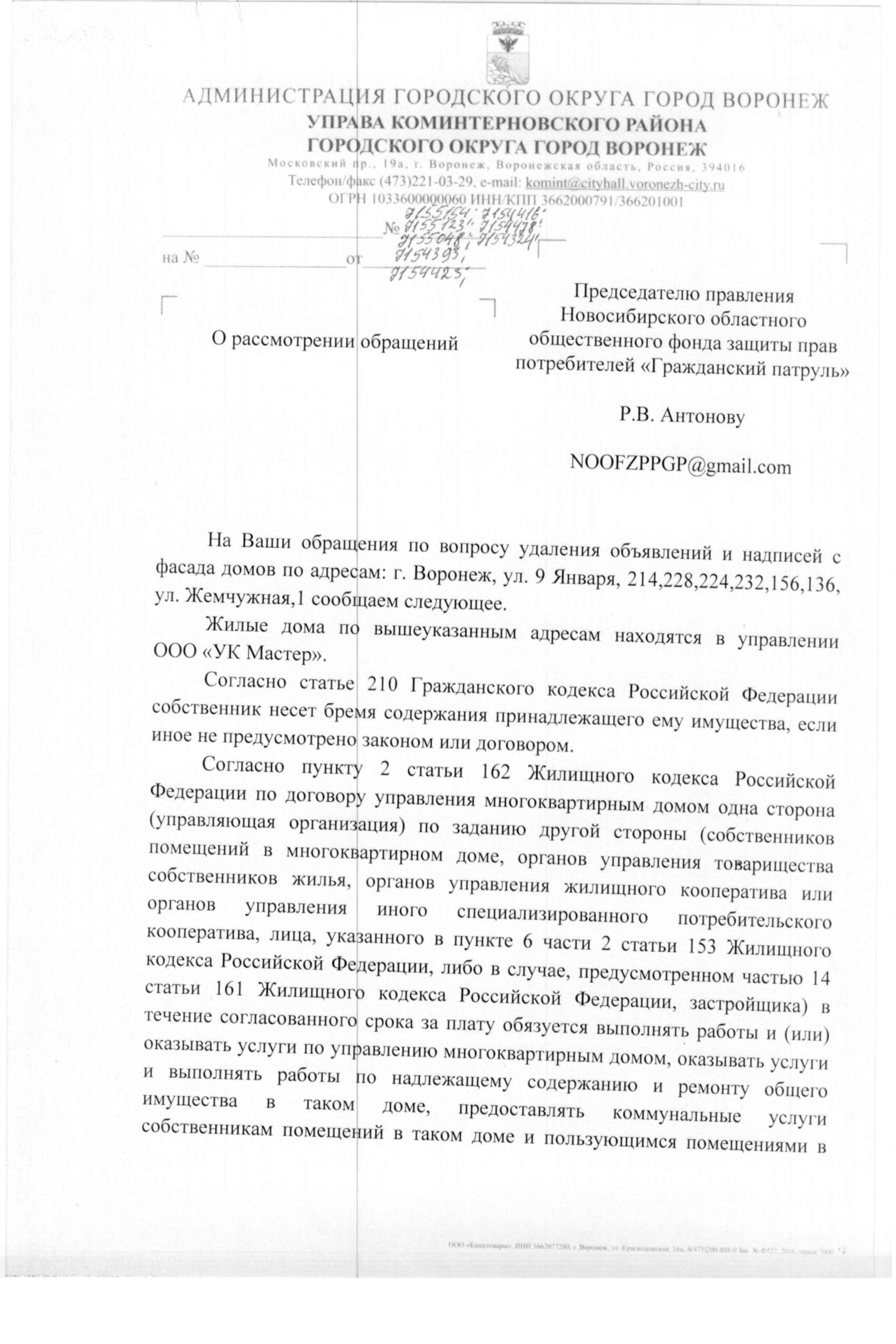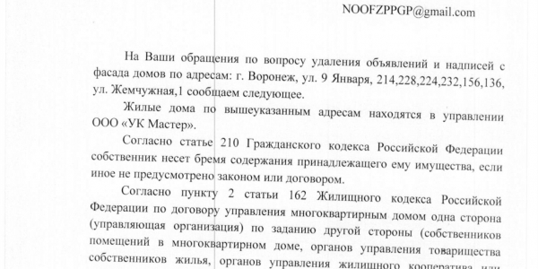 Номер жалобы:14424 Тип жалобы:Иные проблемы ЖКХ Название объекта:Ук Регион:Воронежская область Город:Воронеж Адрес:9-го Января ул., 232 Описание жалобы:Надписи и обьявления Статус: