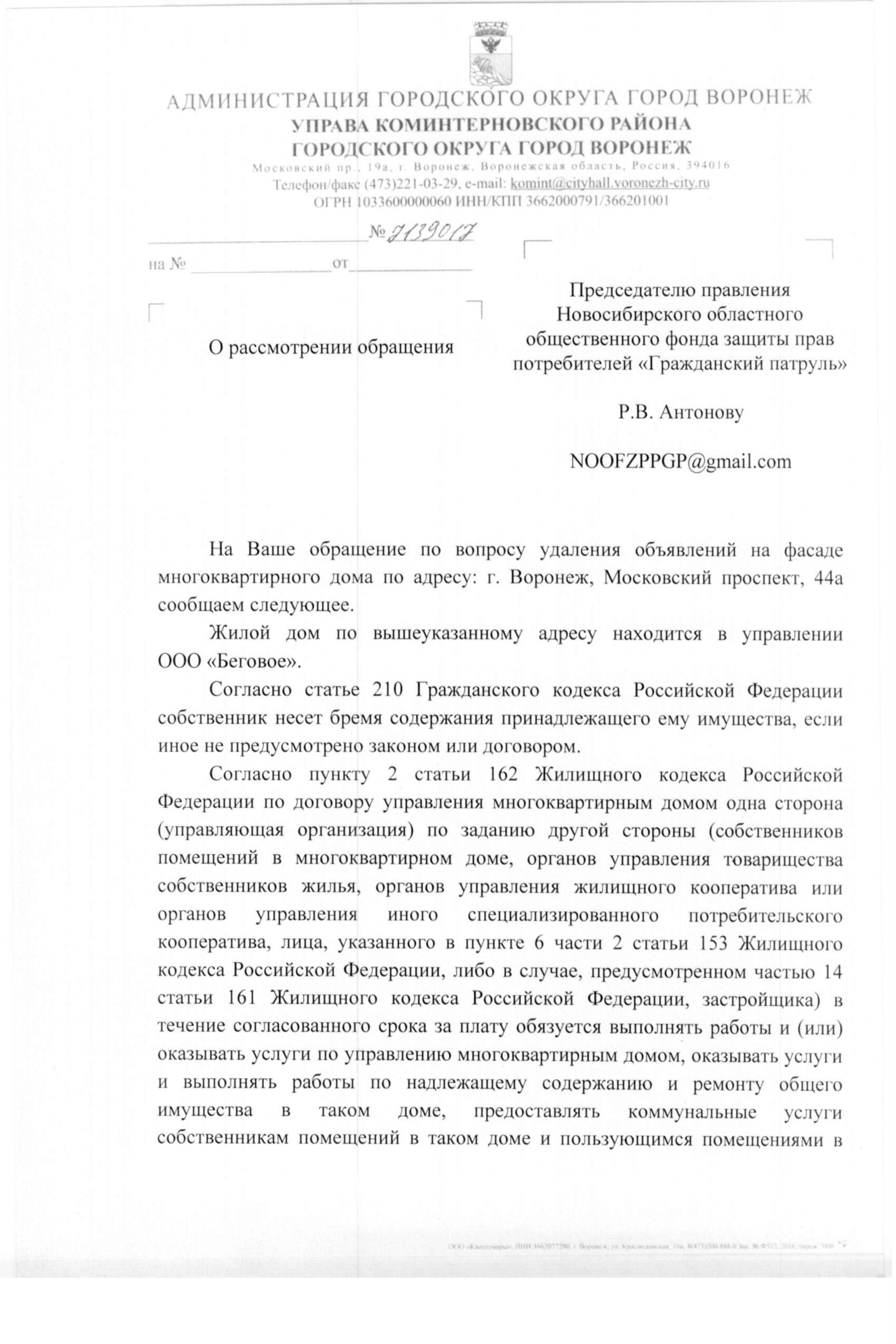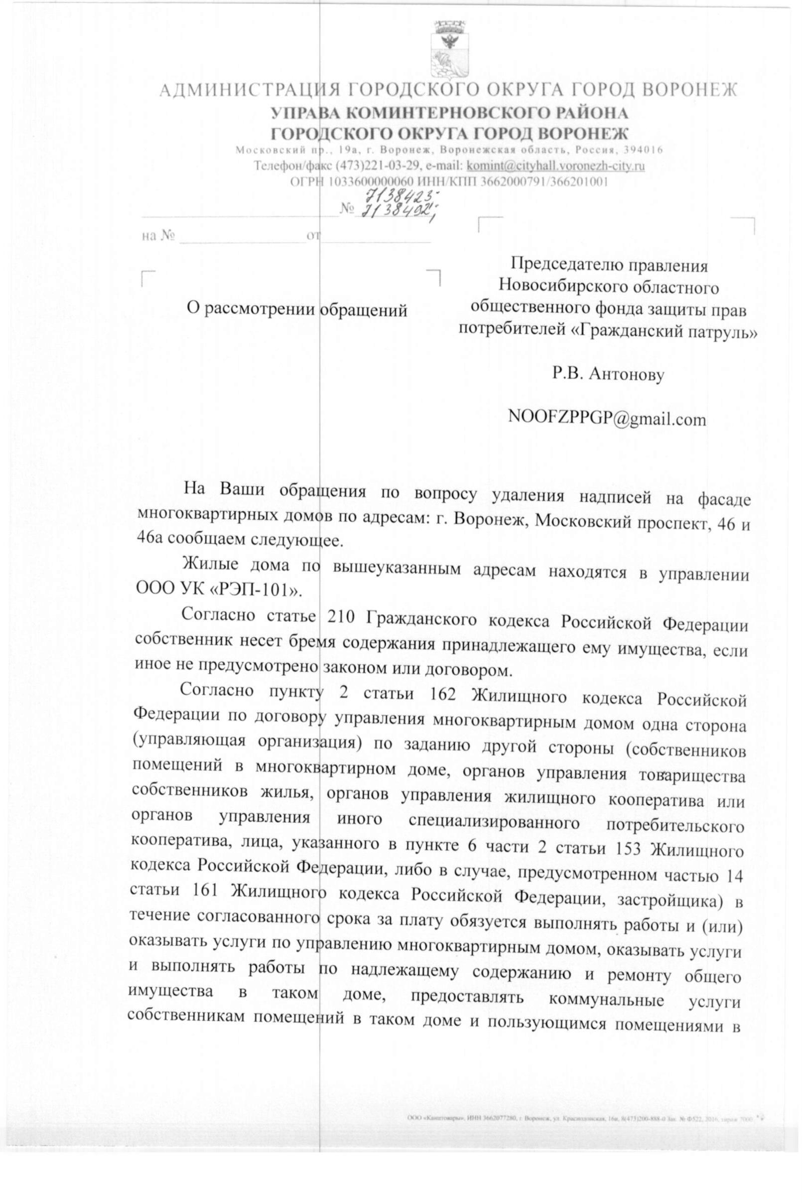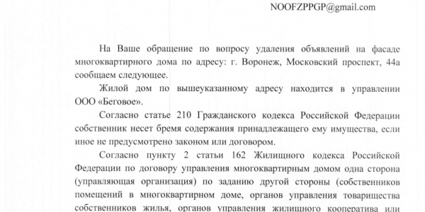 Номер жалобы:14340 Тип жалобы:Иные проблемы ЖКХ Название объекта:Ук Регион:Воронежская область Город:Воронеж Адрес:Московский просп., 46А Описание жалобы:Надписи и обьявления Статус: