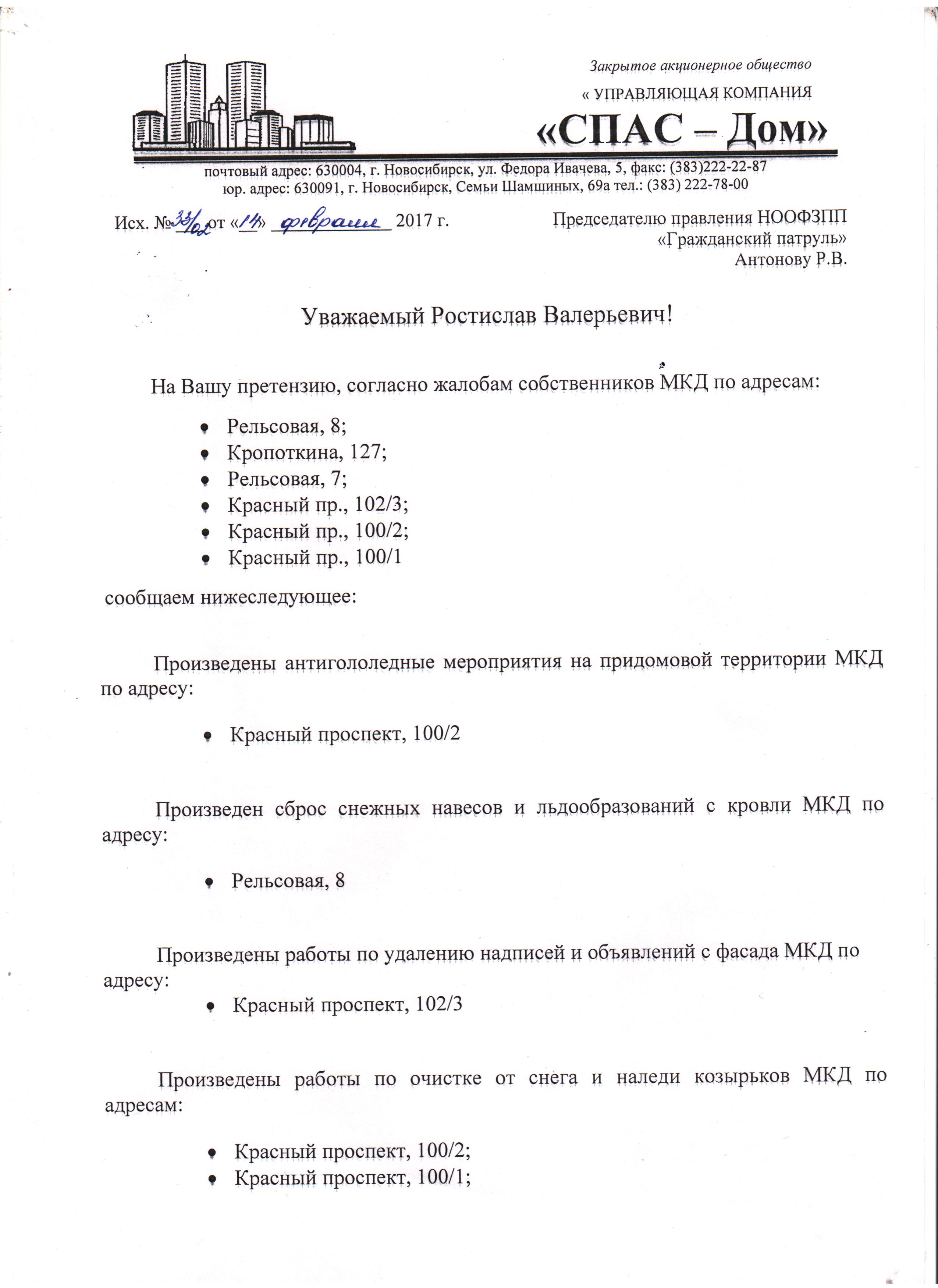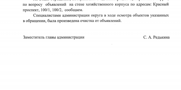 Номер жалобы:14270 Тип жалобы:Иные проблемы ЖКХ Название объекта:Управляющая Компания Город:Новосибирск Адрес:Новосибирск, Красный проспект, 100/1 Описание жалобы:объявлкния на хоз корпусе Статус: