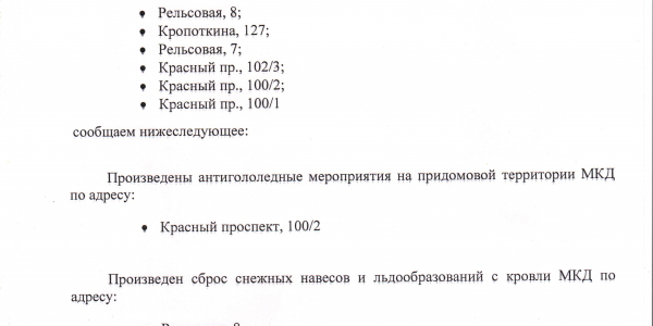 Номер жалобы:14267 Тип жалобы:Иные проблемы ЖКХ Название объекта:Управляющая Компания Город:Новосибирск Адрес:Новосибирск, Красный проспект, 100 Описание жалобы:Объявления в неположенном месте Статус:
