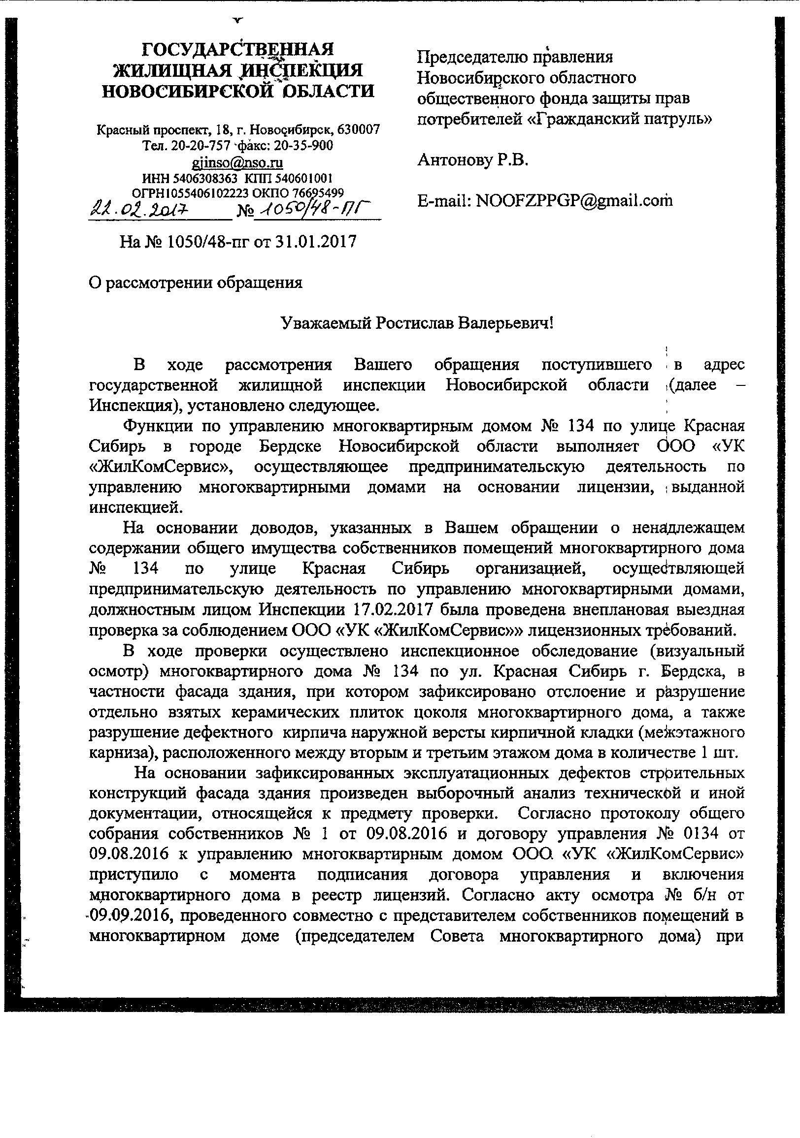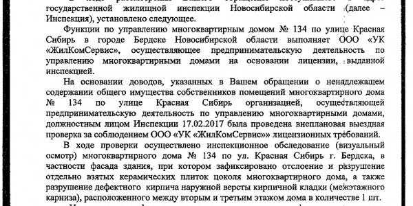 Номер жалобы:14010 Тип жалобы:Иные проблемы ЖКХ Название объекта:Тсж Жилкомсервис Регион:Новосибирская область Город:Бердск Адрес:ул. Красная Сибирь, 134 Описание жалобы:Разрушается карниз между 2 и 3 этажом Бердск красная Сибирь 134 Статус: