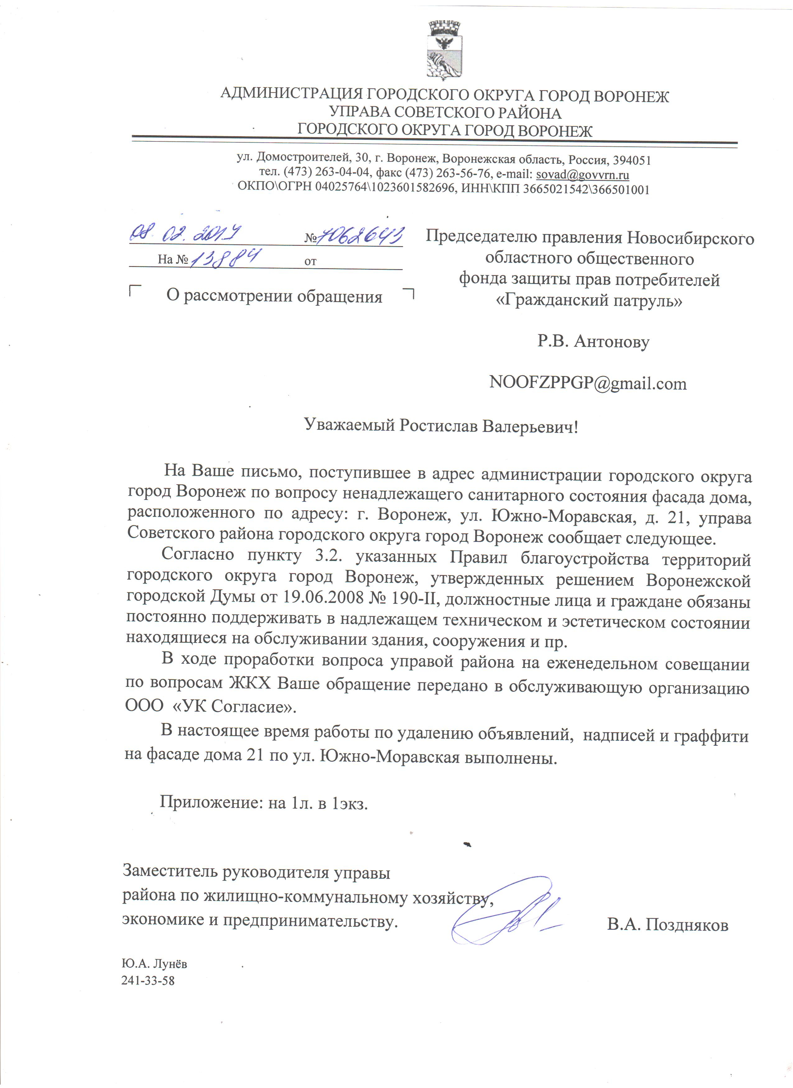 Номер жалобы:13893 Тип жалобы:Иные проблемы ЖКХ Название объекта:Ук Регион:Воронежская область Город:Воронеж Адрес:ул. Молодогвардейцев, 5/13 Описание жалобы:Надписи на мкд Статус: