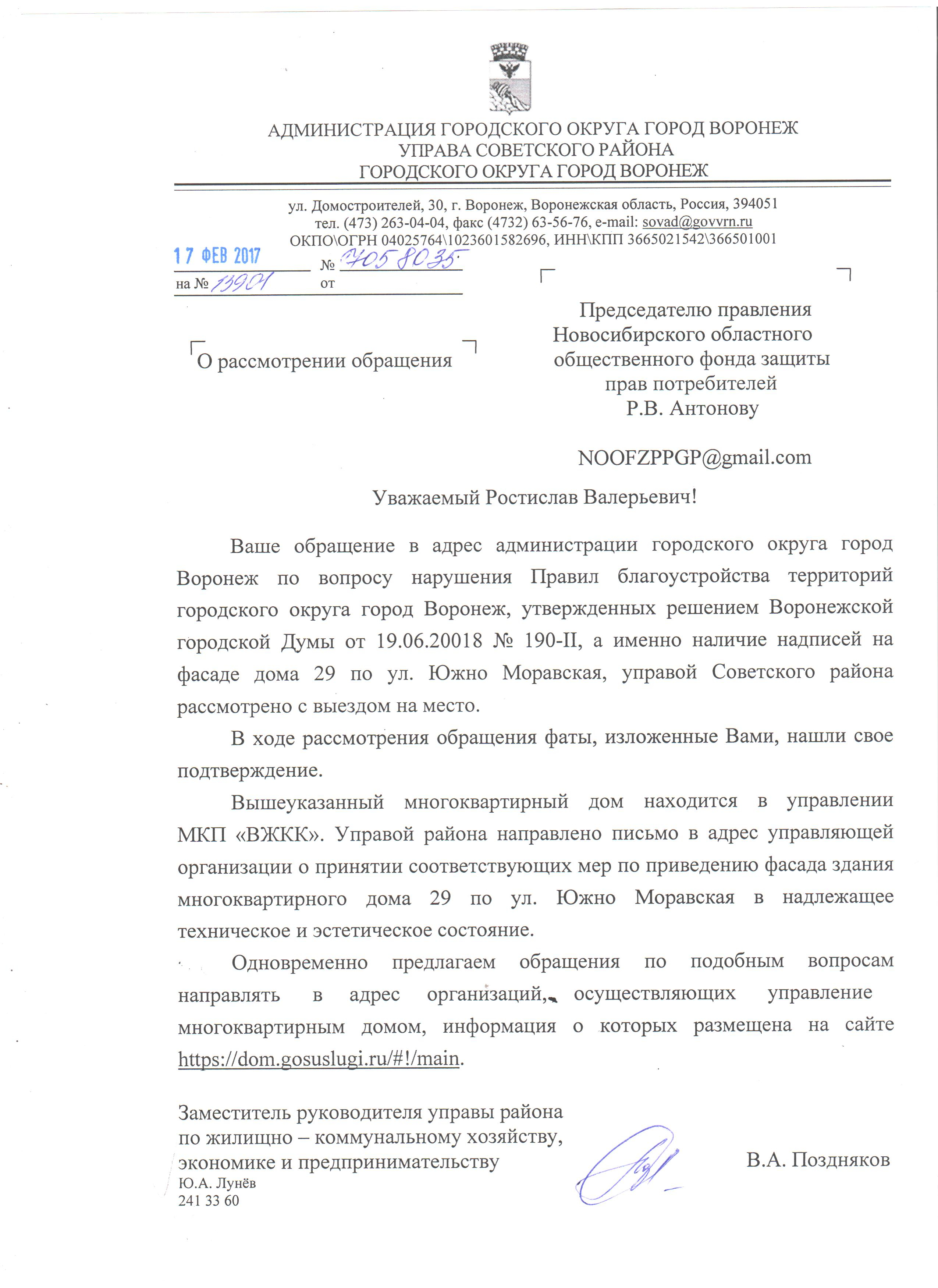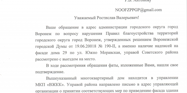 Номер жалобы:13901 Тип жалобы:Иные проблемы ЖКХ Название объекта:Ук Регион:Воронежская область Город:Воронеж Адрес:Южно-Моравская ул., 29 Описание жалобы:Надписи на жилом доме Статус:
