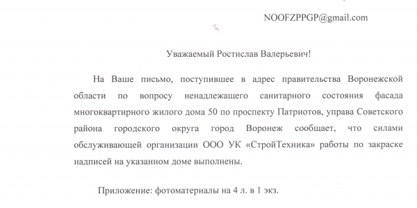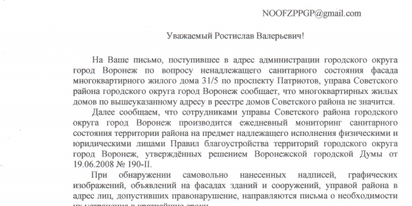 Номер жалобы:13904 Тип жалобы:Иные проблемы ЖКХ Название объекта:Ук Регион:Воронежская область Город:Воронеж Адрес:пр. Патриотов, 50 Описание жалобы:Надписи Статус: