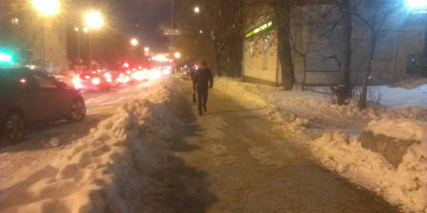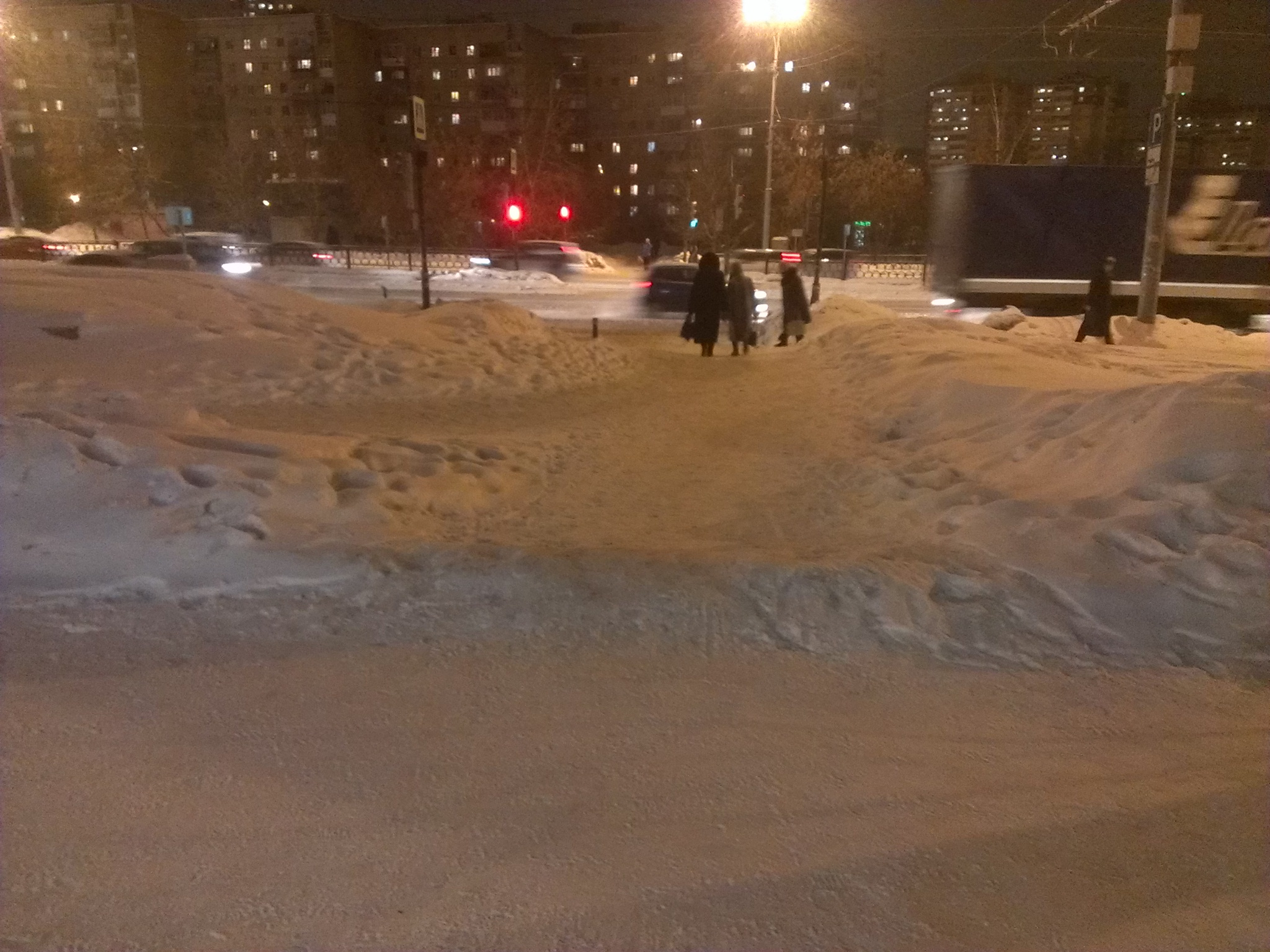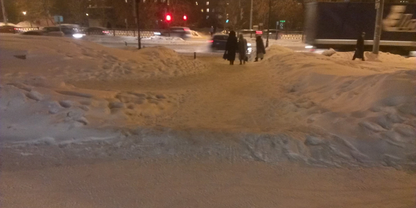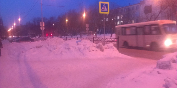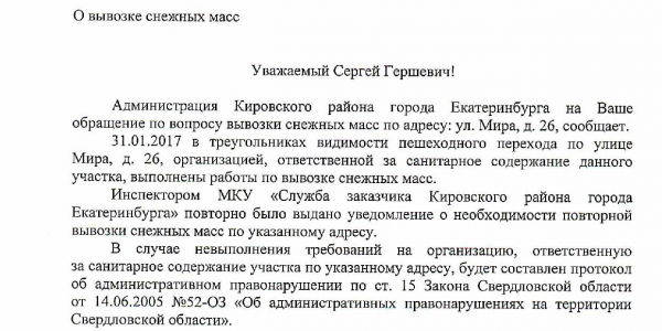 Номер жалобы:14249 Тип жалобы:Качество уборки снега на тротуарах Название объекта:Администрация Екатеринбурга Регион:Свердловская область Город:Екатеринбург Адрес:улица Мира, 26/88 Описание жалобы:В треугольниках видимости нерегулируемого пешеходного перехода через Мира складирован снег, скрывающийся пешеходов, подходящих к переходу. По данной проблеме я обращался в жалобе 13159. В ответе администрации говорится, что снежные массы вывезены. Данная информация не соответствует действительности. Снежные кучи вывезены не были, а после выполнения очистки подходов к пешеходному переходу высота куч увеличилась. Статус: