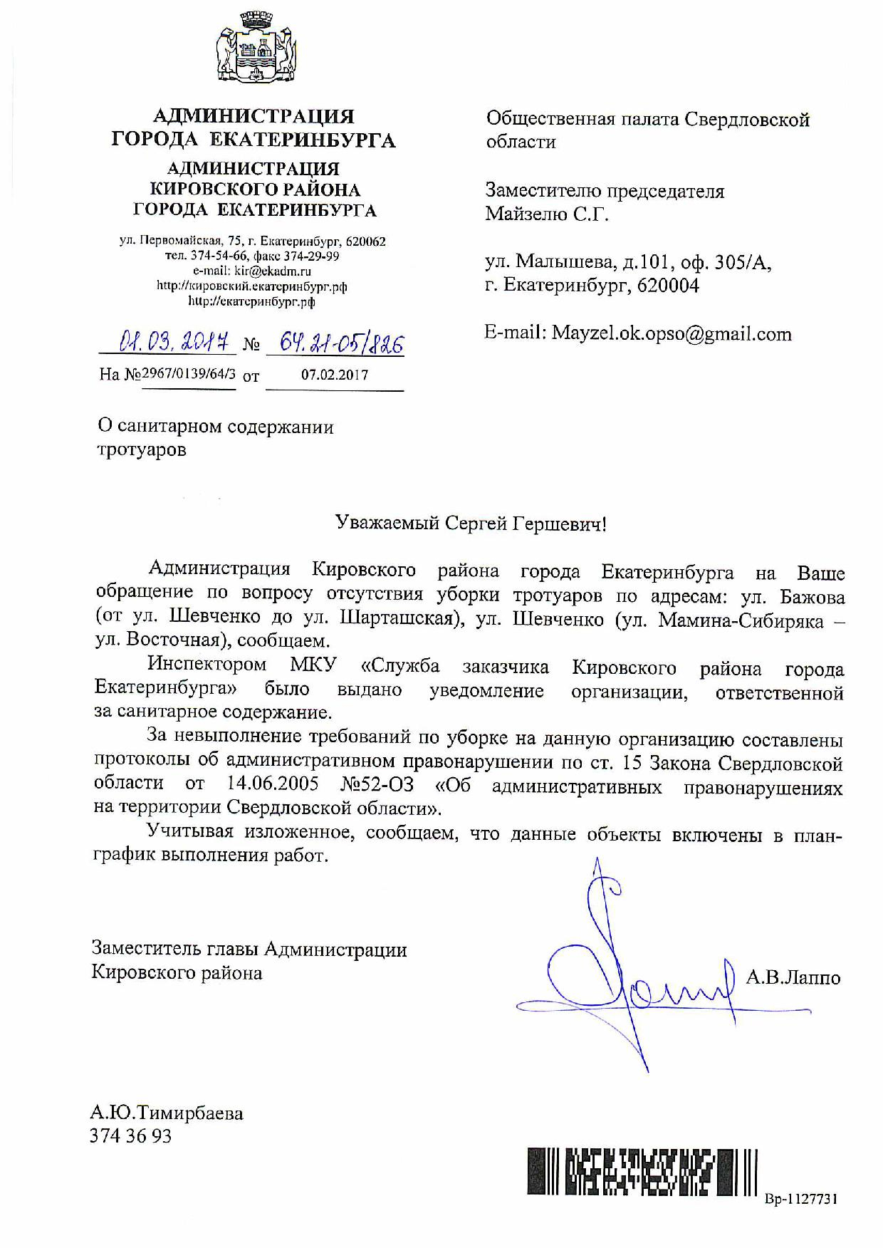Номер жалобы:14202 Тип жалобы:Качество уборки снега на тротуарах Название объекта:Администрация Екатеринбурга Регион:Свердловская область Город:Екатеринбург Адрес:улица Азина Описание жалобы:Согласно пункту 51 правил благоустройства Екатеринбурга запрещается обрабатывать тротуары поваренной солью. Однако 2 февраля 2017 года тротуары вдоль чётной стороны улицы Челюскинцев на участке от улицы Азина до переулка Невьянского, вдоль нечётной стороны улицы Азина на участке от улицы Испанских Рабочих до улицы Челюскинцев, вдоль нечётной стороны улицы Шевченко на участке от улицы Мамина-Сибиряка до улицы Луначарского были обработаны поваренной солью с целью удаления снега. Статус: