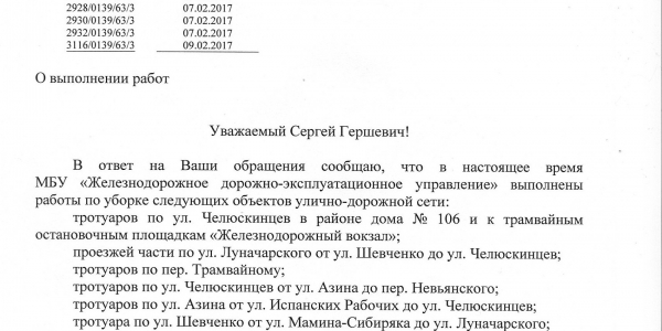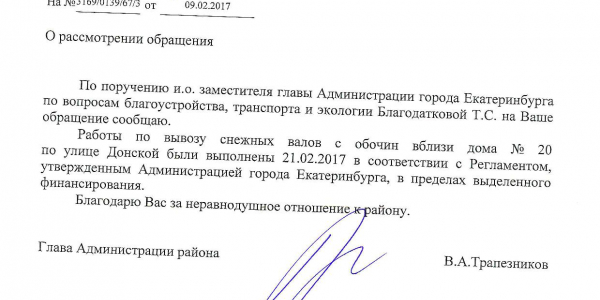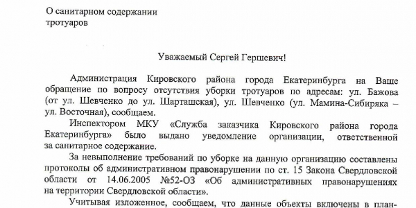 Номер жалобы:14197 Тип жалобы:Качество уборки снега на тротуарах Название объекта:Администрация Екатеринбурга Регион:Свердловская область Город:Екатеринбург Адрес:Трамвайный переулок Описание жалобы:Неудовлетворительно произведена уборка снега на обоих тротуарах вдоль переулка Трамвайного. Уборка выполнена выборочно, на стыке очищенных и неочищенных участков получился высокий перепад, затрудняющий передвижение пешеходов. Неочищенные участки в текущий зимний период от снега ни разу не очищались. Статус: