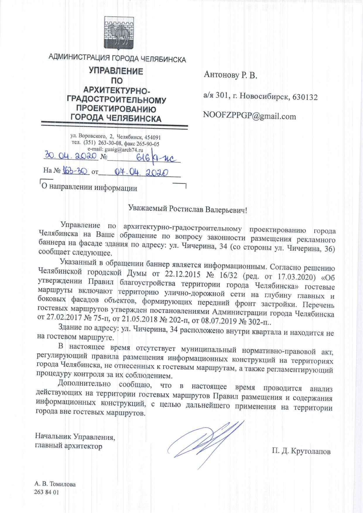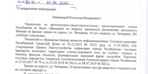Номер жалобы:65191 Тип жалобы:Прочее Название объекта: Регион:Челябинская область Город:Челябинск Адрес:улица Чичерина, 34 Описание жалобы:На фасаде ул. Чичерина, 34 (со стороны Чичерина, 36) размещён рекламный баннер.