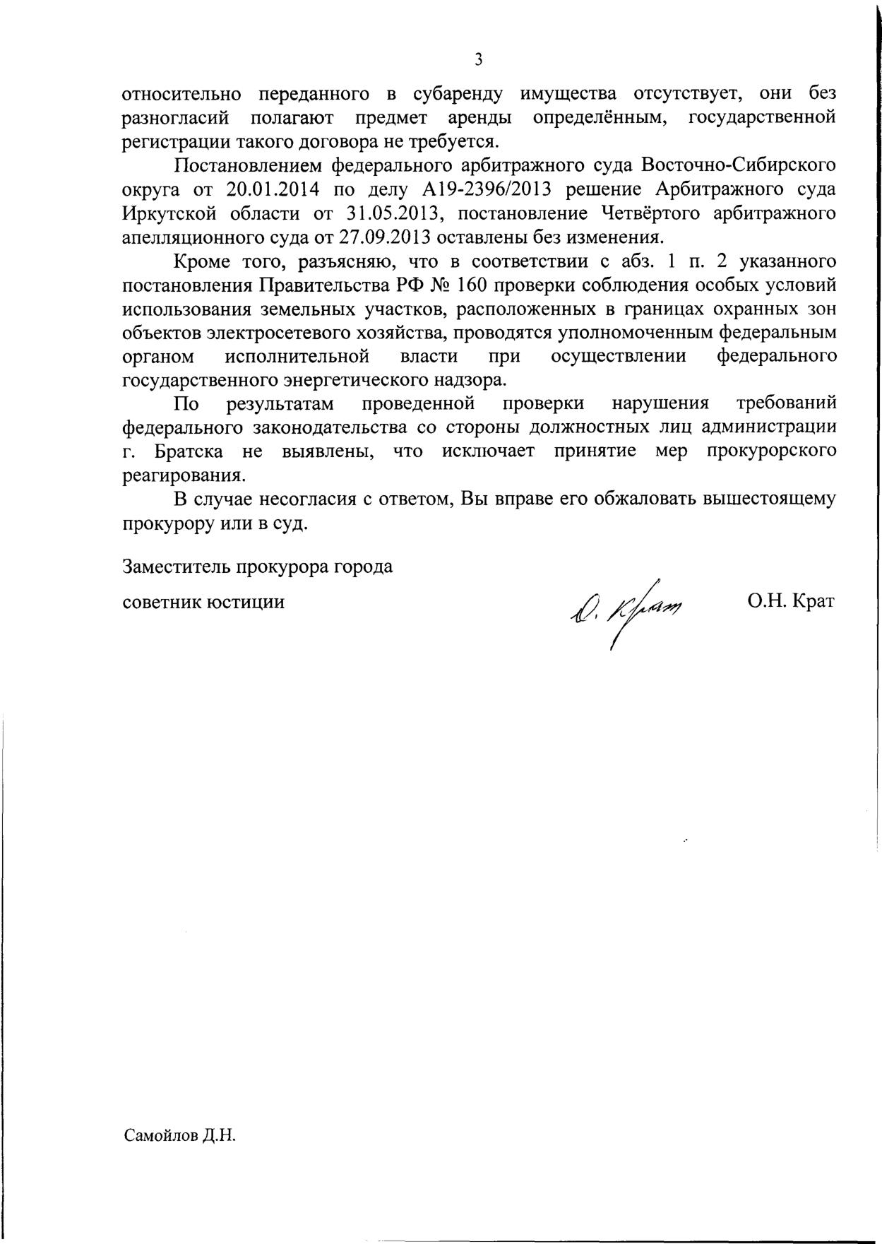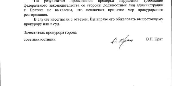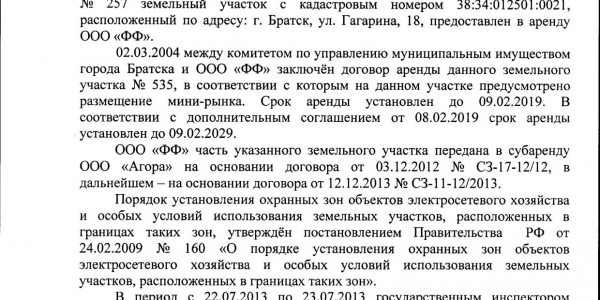 Номер жалобы:65175 Тип жалобы:Прочее Название объекта: Регион:Иркутская область Город:Братск Адрес:ул Гагарина, 18 Описание жалобы:По жалобе 62773 пришел ответ, что Ростехнадзор неоднократно выписывал предписание о устранении нарушений - размещения рынка под ЛЭП 300кВ. Также ОАО "ИЭСК" обращалась в суд, но суд отказал с мотивировкой, что иск заявлен лицом, которое не является лицом оспариваемой сделки. Таким образом оспаривать сделку должна администрация Братска. Но она бездействует, подвергая работников и посетителей указанного участка опасности Статус: