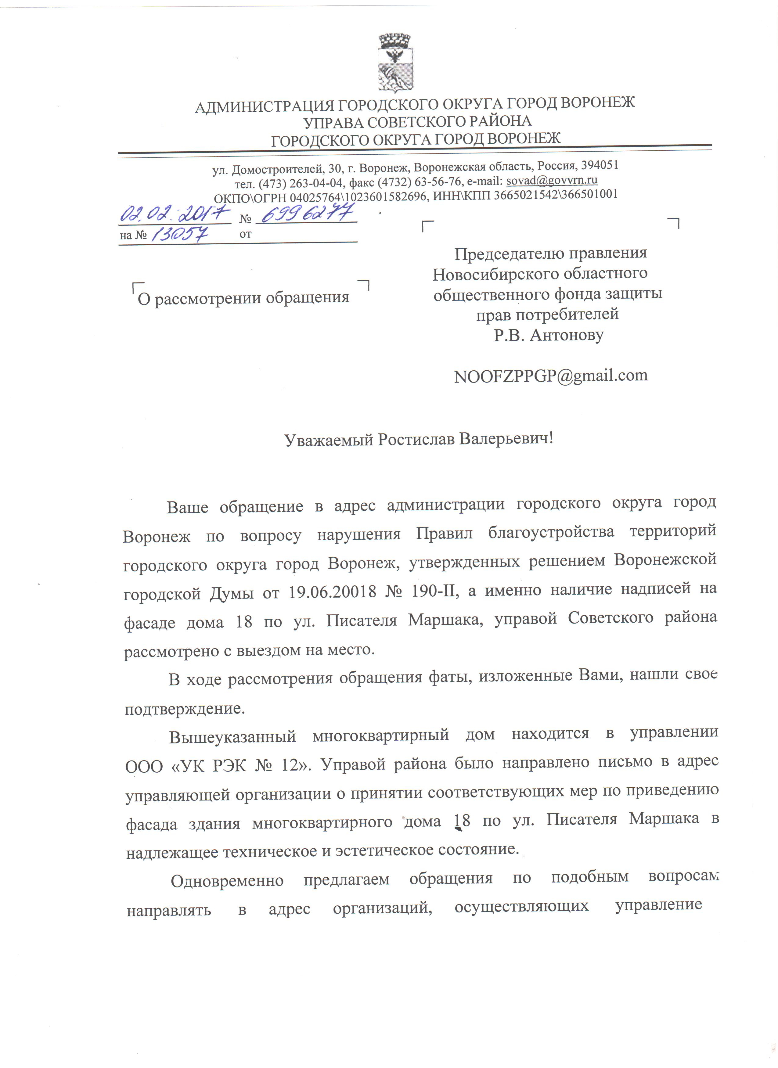 Номер жалобы:13738 Тип жалобы:Иные проблемы ЖКХ Название объекта:Ук Регион:Воронежская область Город:Воронеж Адрес:ул. Свободы, 69А Описание жалобы:Надписи на стенах мкд Статус: