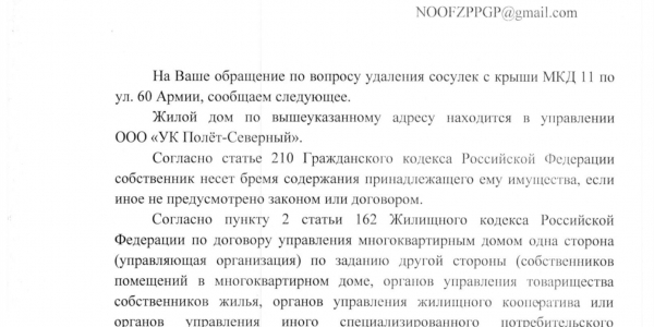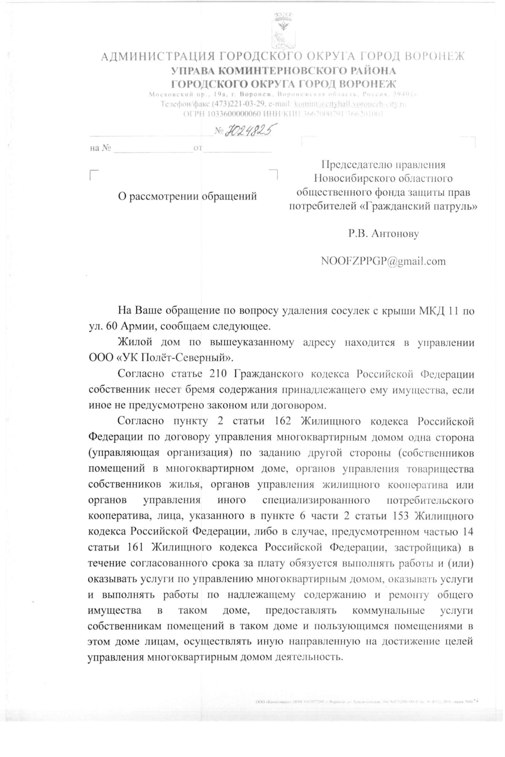 Номер жалобы:13420 Тип жалобы:Иные проблемы ЖКХ Название объекта:Ук Регион:Воронежская область Город:Воронеж Адрес:ул. 60 Армии, 11 Описание жалобы:Сосульки огромные на ком. Здании Статус: