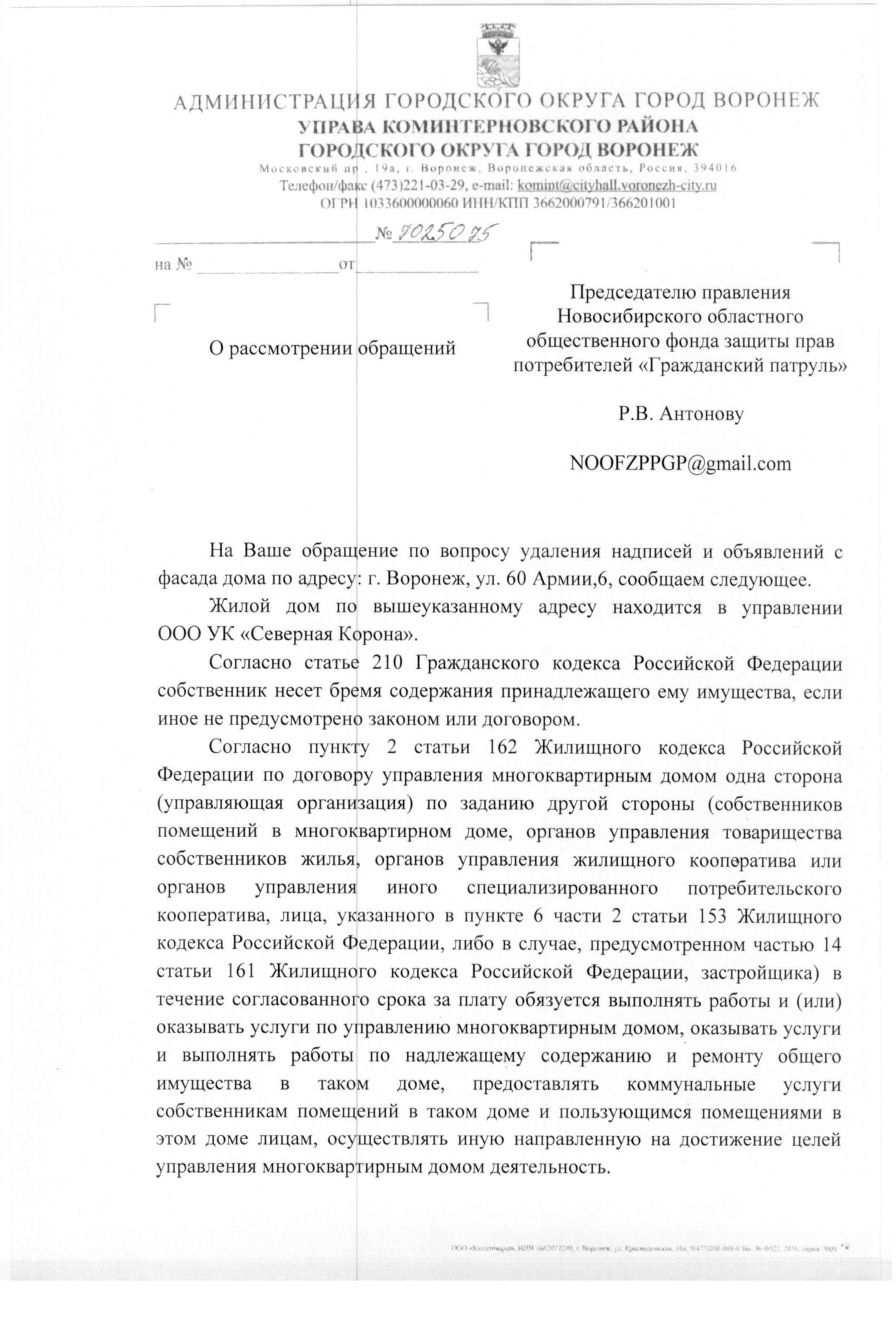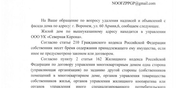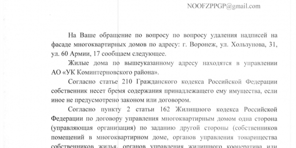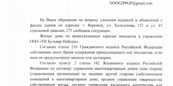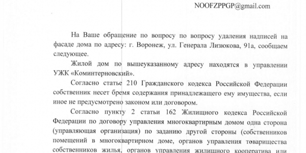 Номер жалобы:13579 Тип жалобы:Иные проблемы ЖКХ Название объекта:Ук Регион:Воронежская область Город:Воронеж Адрес:ул. Генерала Лизюкова, 91А Описание жалобы:Надписи на стенах и обьявления на ж.доме Статус: