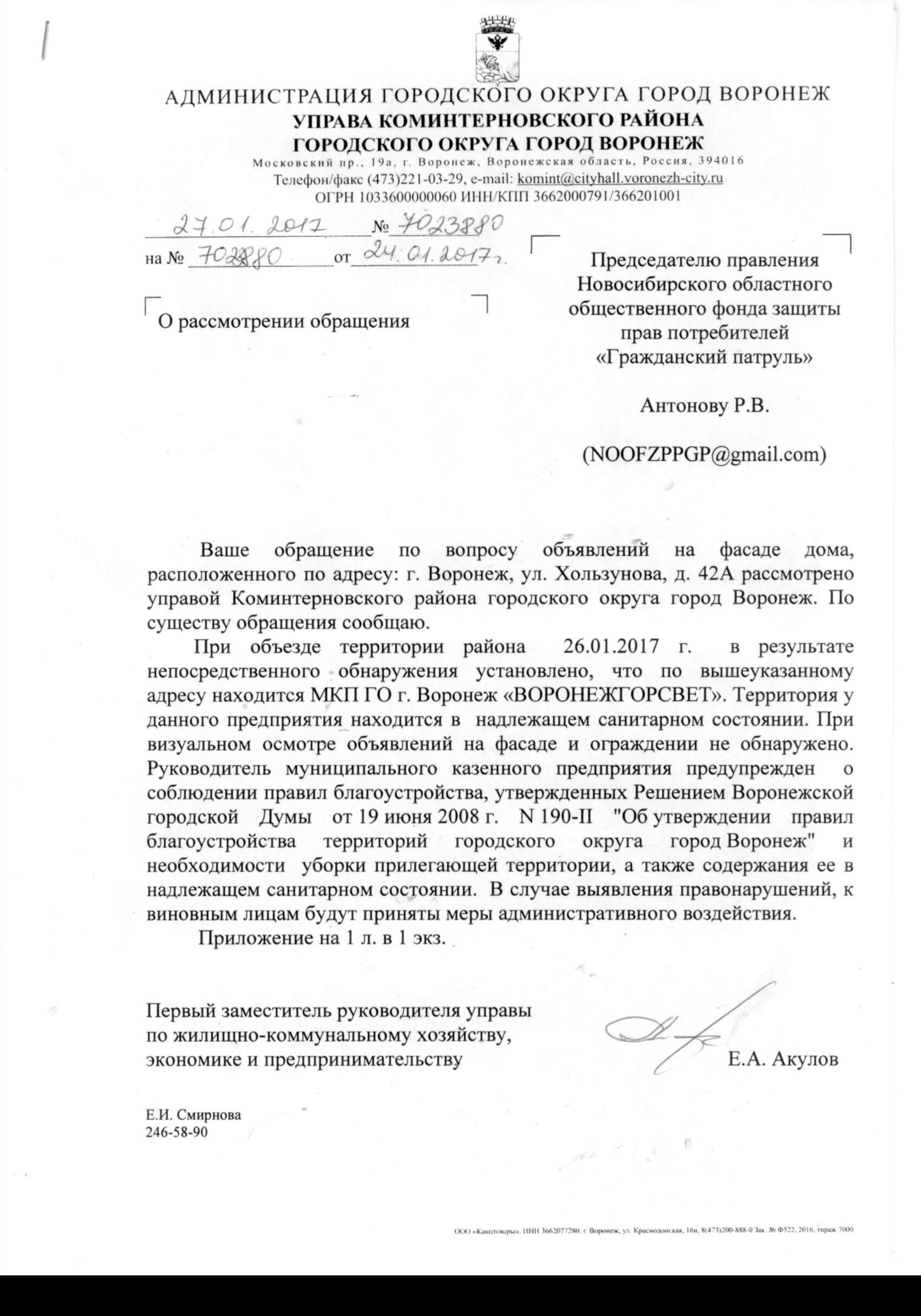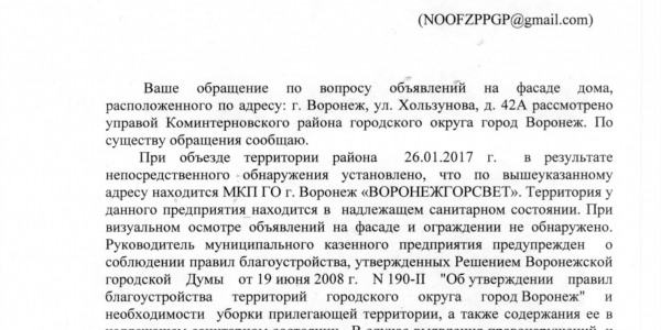 Номер жалобы:13448 Тип жалобы:Иные проблемы ЖКХ Название объекта:Ук Регион:Воронежская область Город:Воронеж Адрес:ул. Хользунова, 42А Описание жалобы:Обьявления в неп месте Статус:
