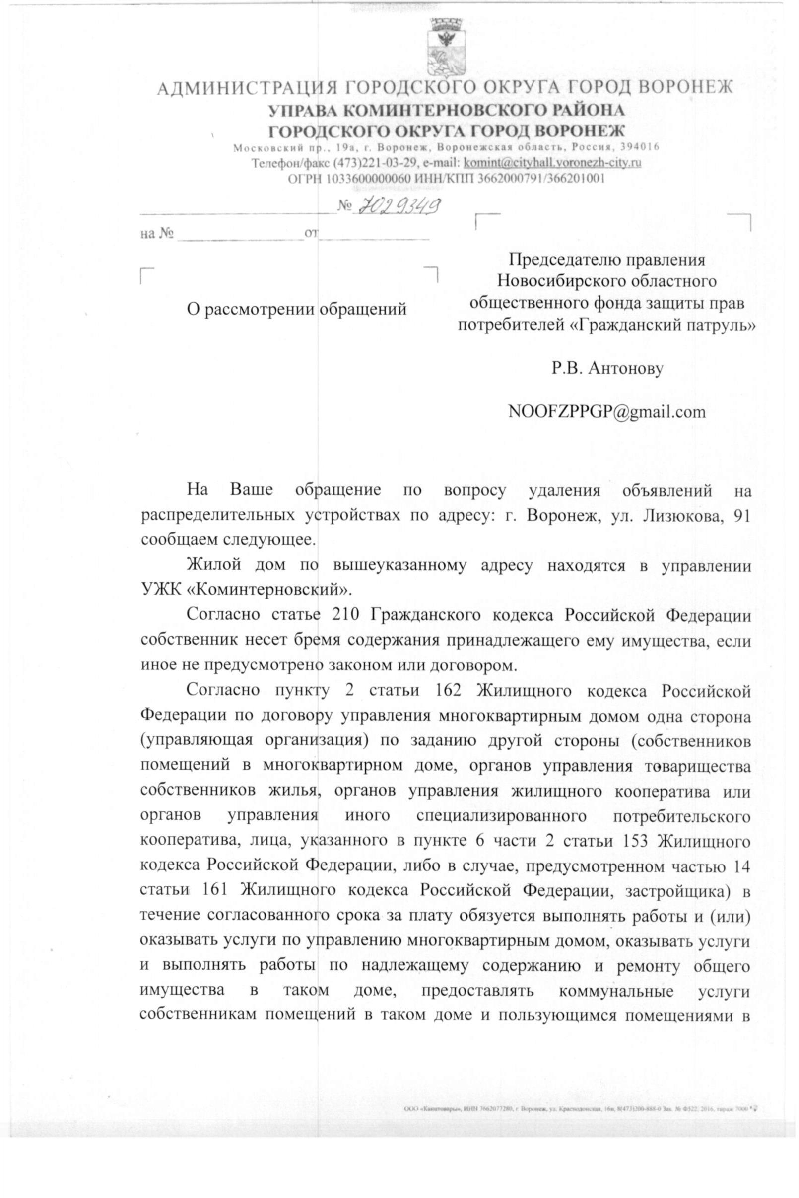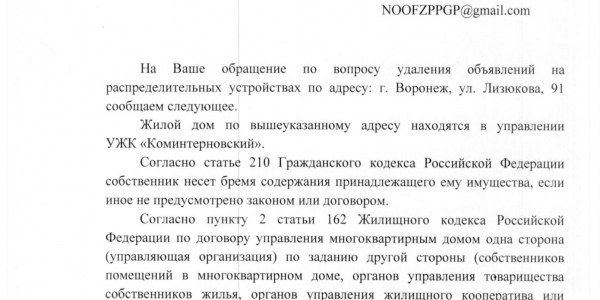 Номер жалобы:13570 Тип жалобы:Иные проблемы ЖКХ Название объекта:Упр. Компания Регион:Воронежская область Город:Воронеж Адрес:ул. Генерала Лизюкова, 91 Описание жалобы:Обьявления на жилом доме Статус: