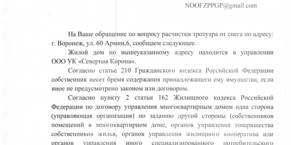 Номер жалобы:13413 Тип жалобы:Иные проблемы ЖКХ Название объекта:Ук Регион:Воронежская область Город:Воронеж Адрес:ул. 60 Армии, 6 Описание жалобы:Не расчищен тратуар Статус: