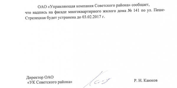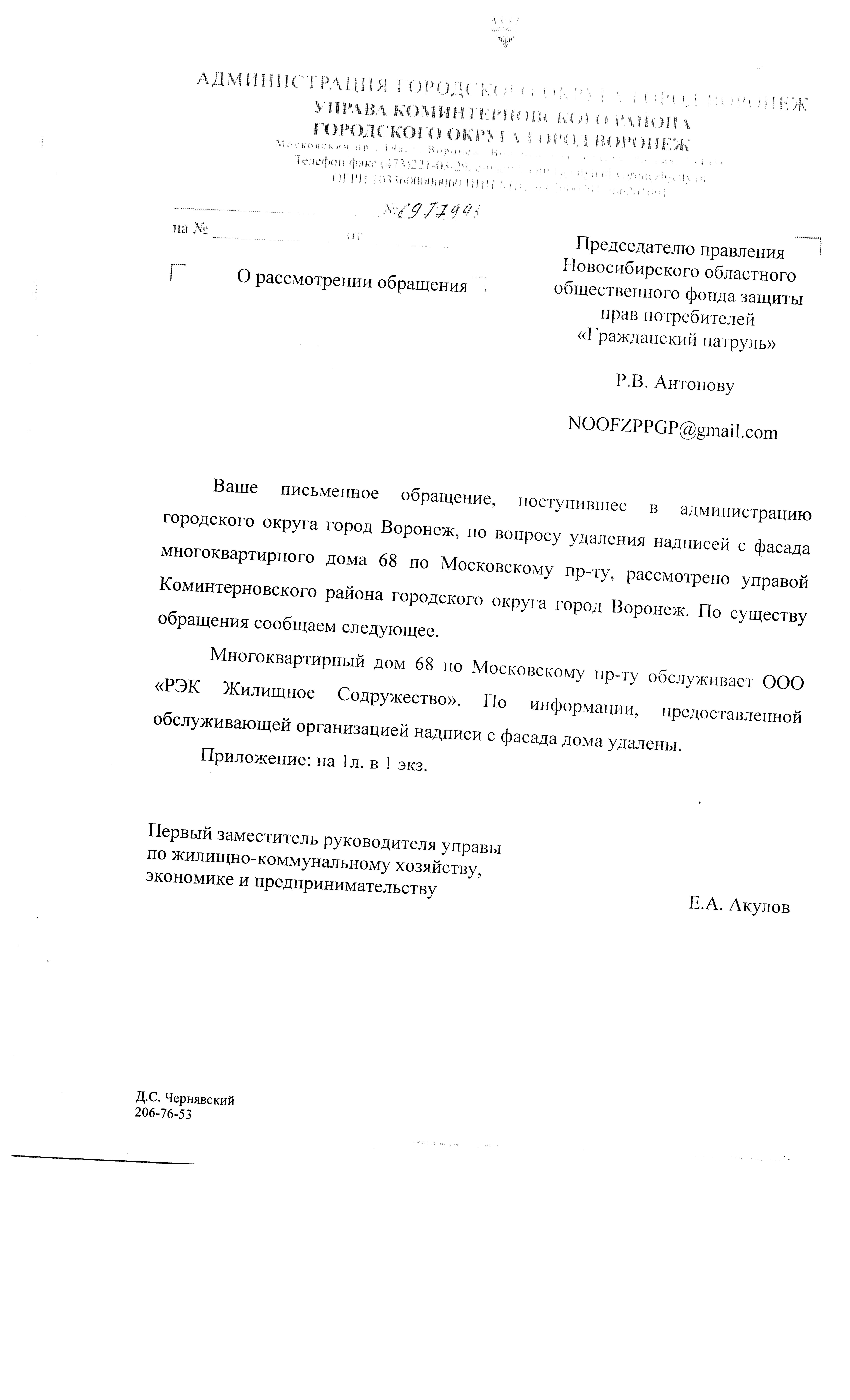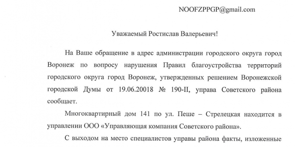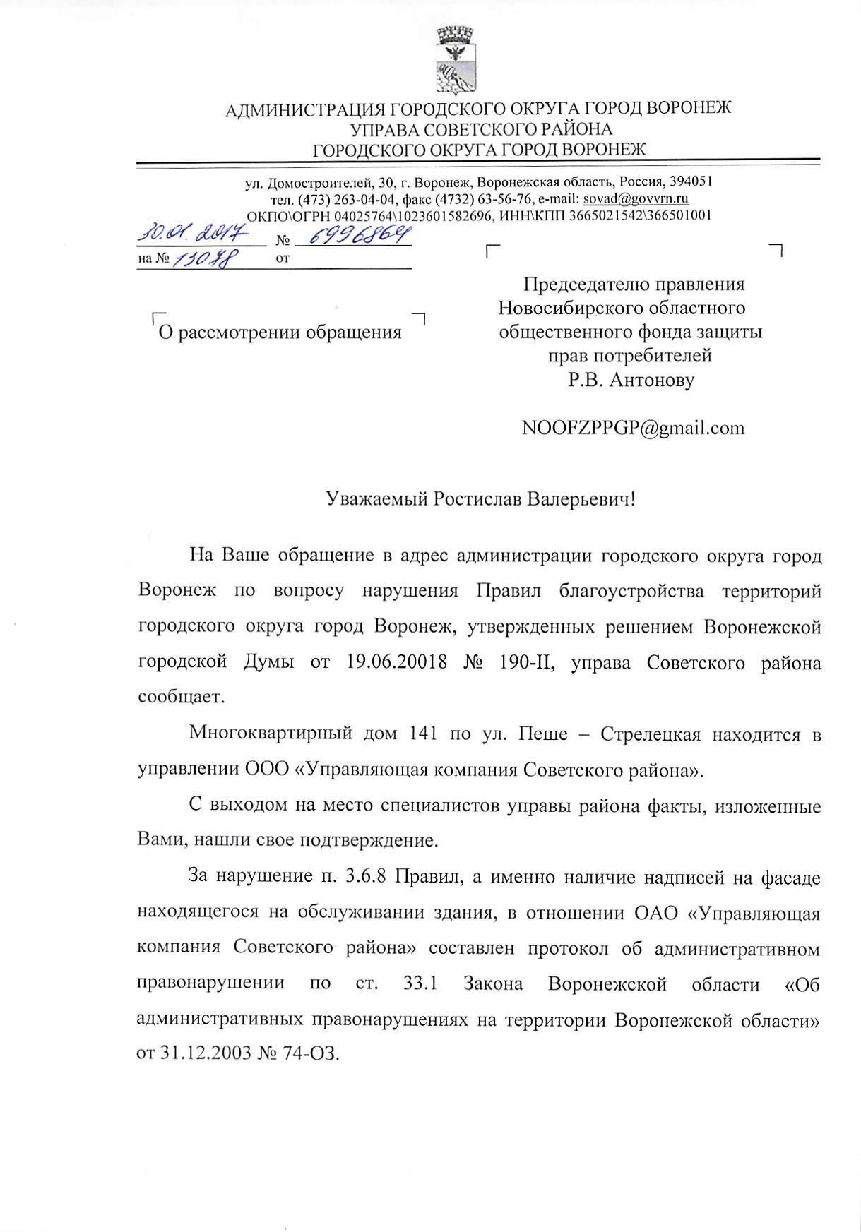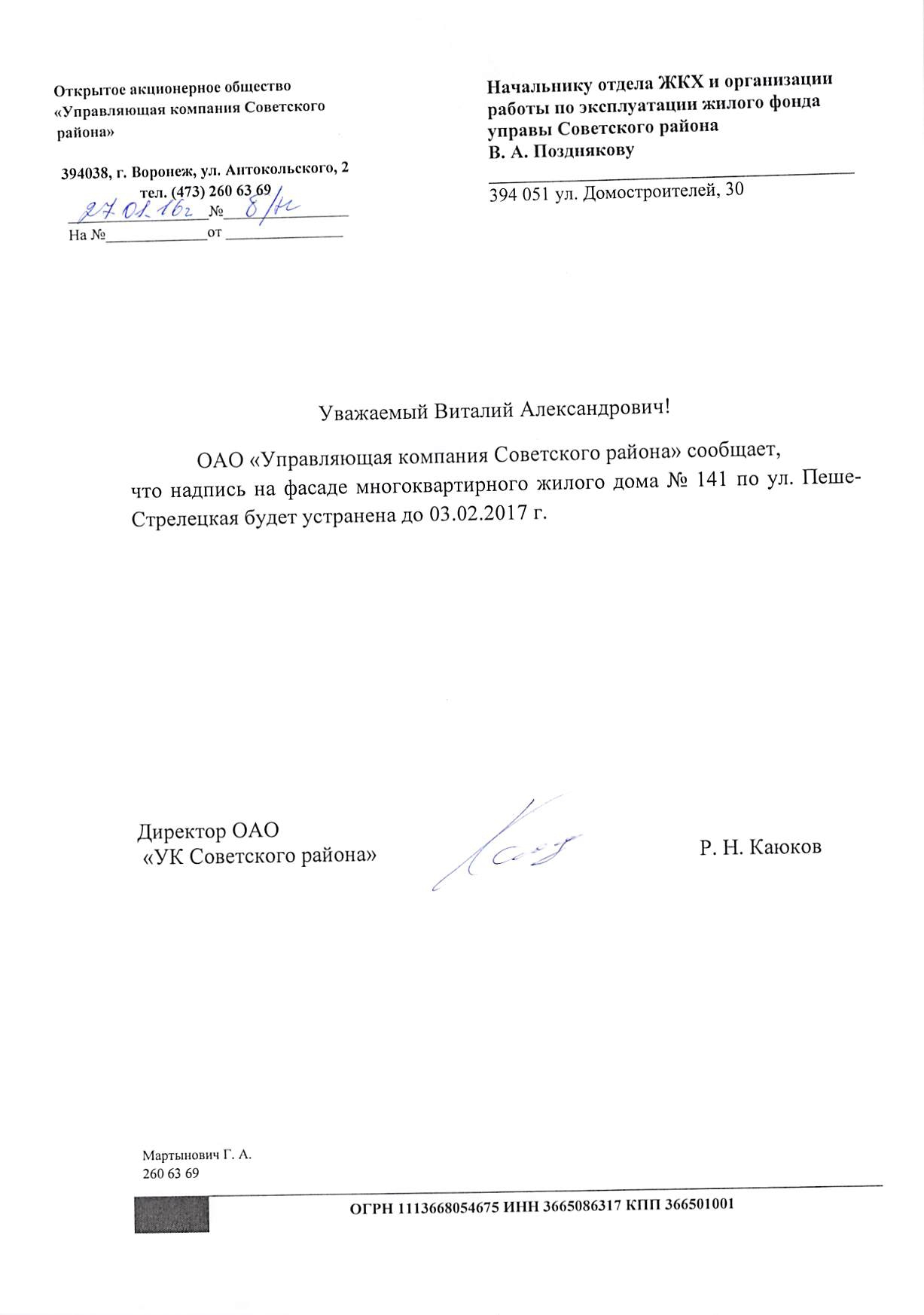 Номер жалобы:13078 Тип жалобы:Иные проблемы ЖКХ Название объекта:Ук Регион:Воронежская область Город:Воронеж Адрес:ул. Пеше-Стрелецкая, 141 Описание жалобы:Надписи на стенах мкд Статус: