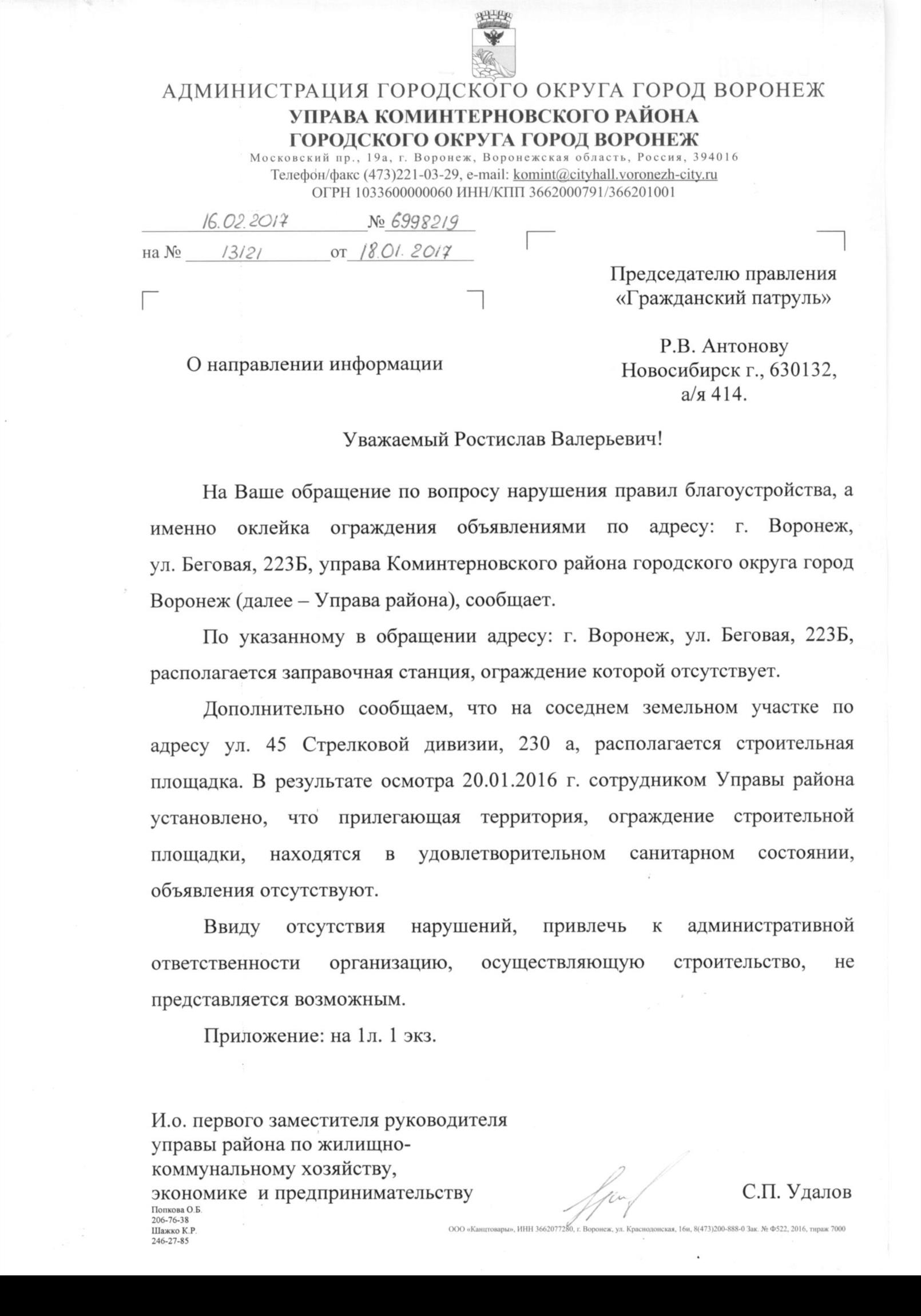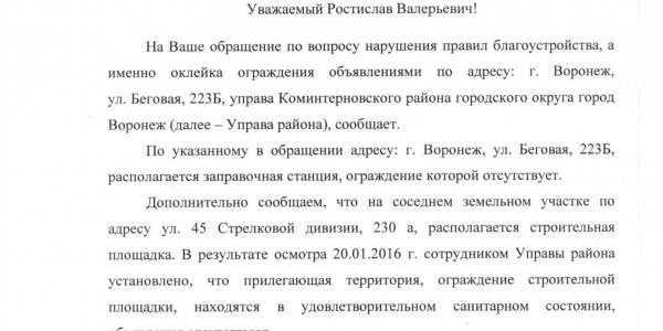 Номер жалобы:13121 Тип жалобы:Иные проблемы ЖКХ Название объекта:Ук Регион:Воронежская область Город:Воронеж Адрес:ул. Беговая, 223Б Описание жалобы:Рекламные обьявления в неполож. Месте Статус: