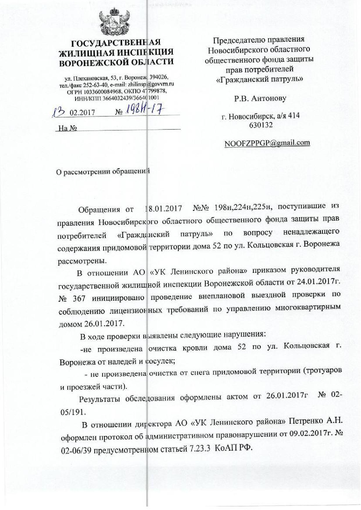 Номер жалобы:12881 Тип жалобы:Иные проблемы ЖКХ Название объекта:УК Город:Воронеж Адрес:Воронеж, улица Кольцовская, 52 Описание жалобы:Сорвано ограждение на крыше снегом Статус: