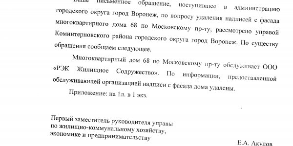 Номер жалобы:12739 Тип жалобы:Иные проблемы ЖКХ Название объекта:Ук Регион:Воронежская область Город:Воронеж Адрес:Московский просп., 68 Описание жалобы:Рисунки на стенах жилого дома Статус:
