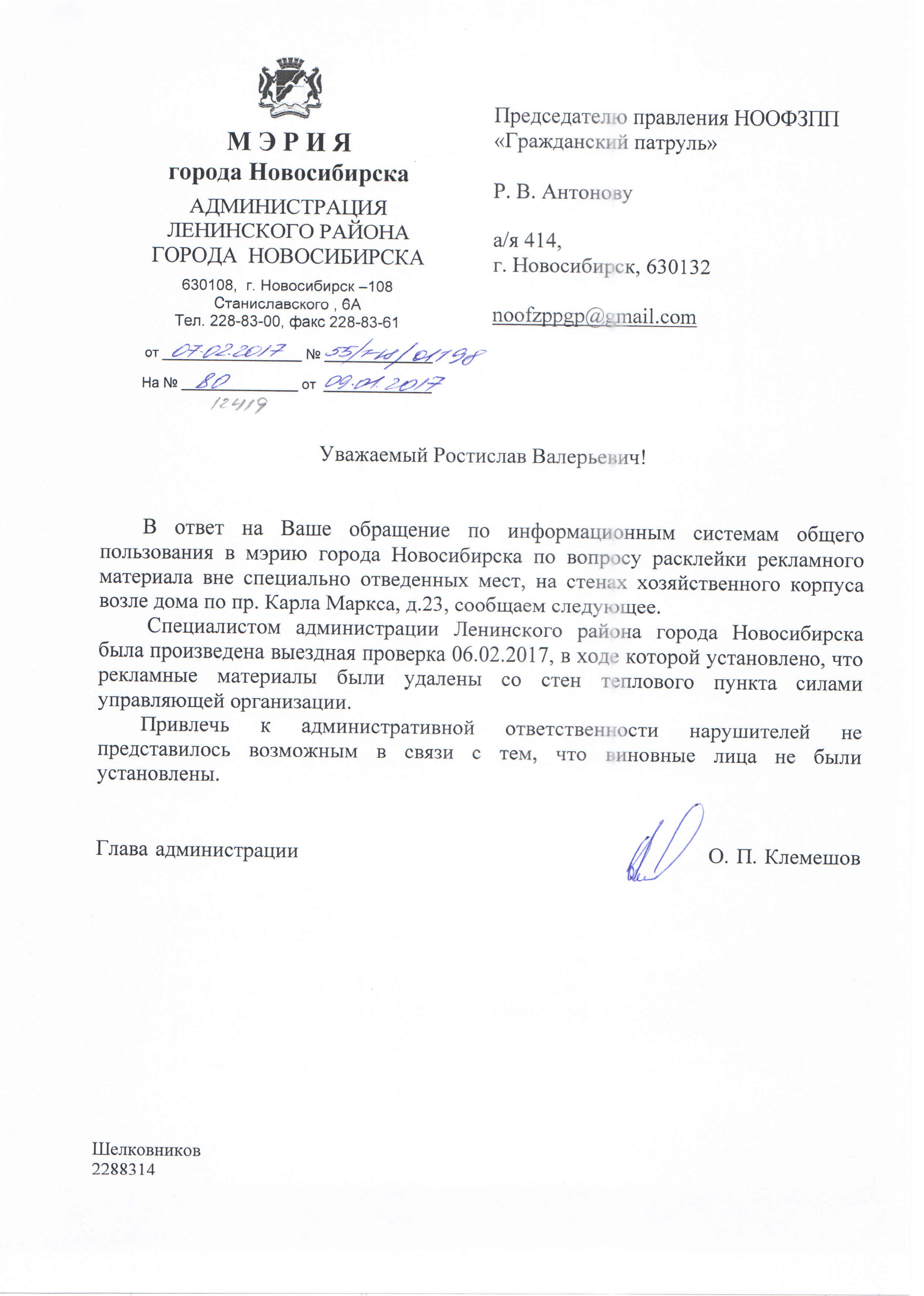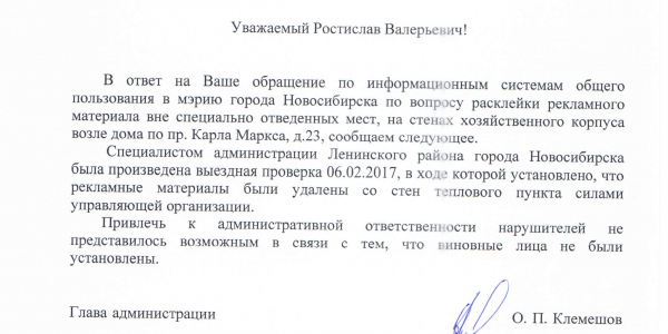 Номер жалобы:12419 Тип жалобы:Иные проблемы ЖКХ Название объекта:Ук Регион:Новосибирская область Город:Новосибирск Адрес:пр. Карла Маркса, 23 Описание жалобы:Надписи на фасаде, расклейка Статус: