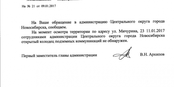 Номер жалобы:12467 Тип жалобы:Иные проблемы ЖКХ Название объекта:Сети Регион:Новосибирская область Город:Новосибирск Адрес:ул. Мичурина, 23 Описание жалобы:Открытый люк Статус: