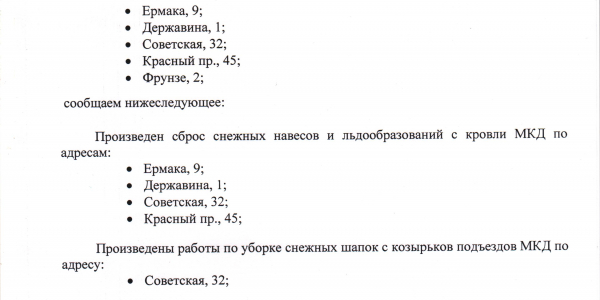 Номер жалобы:11892 Тип жалобы:Иные проблемы ЖКХ Название объекта:Управляющая Компания Город:Новосибирск Адрес:Новосибирск, улица Советская, 30 Описание жалобы:Снег на крыше дома Статус: