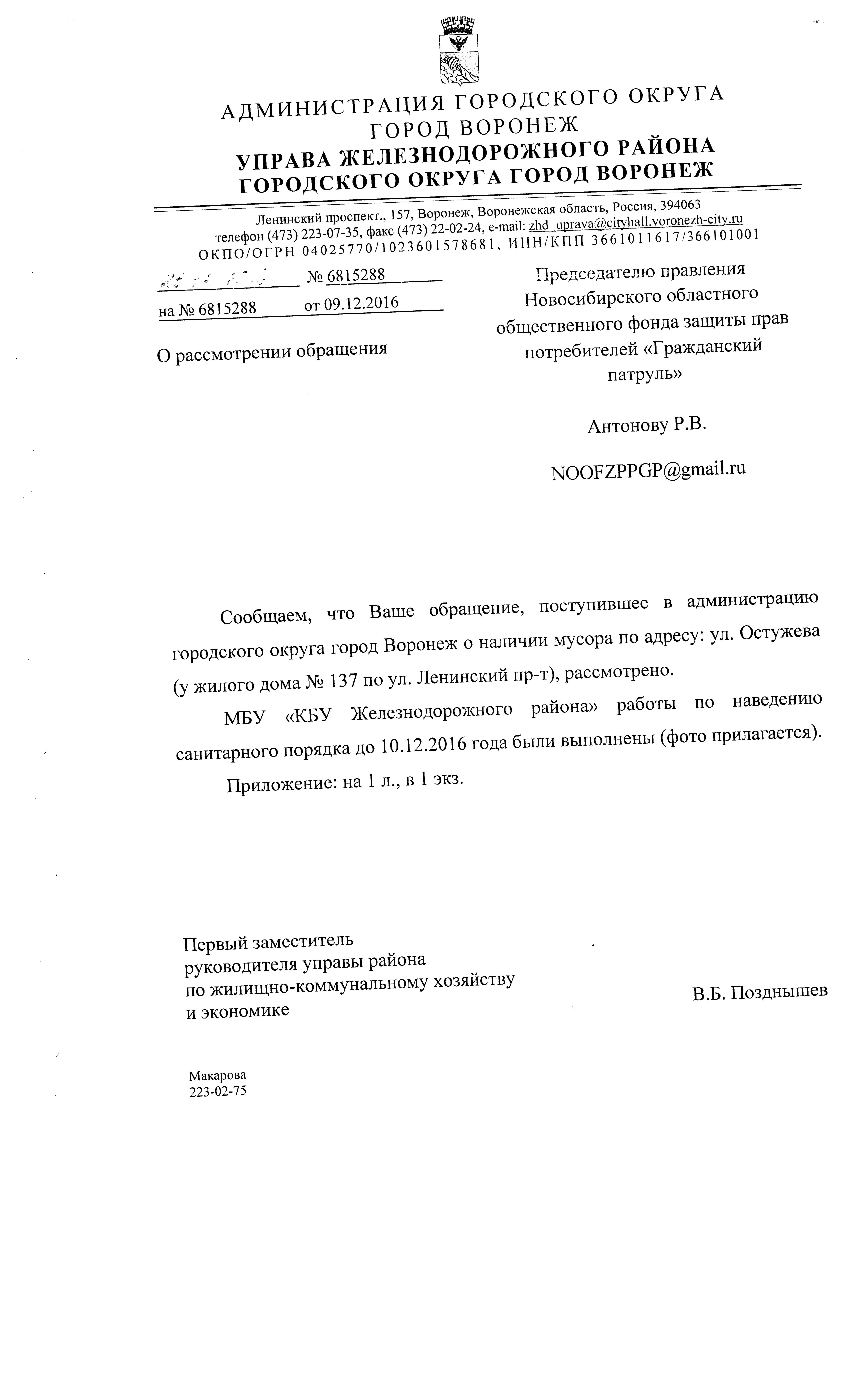 Номер жалобы:11781 Тип жалобы:Иные проблемы ЖКХ Название объекта:Общественная Организация Регион:Воронежская область Город:Воронеж Адрес:ул. Новосибирская, 33 Описание жалобы:Мусор рядом с домами валяется Статус: