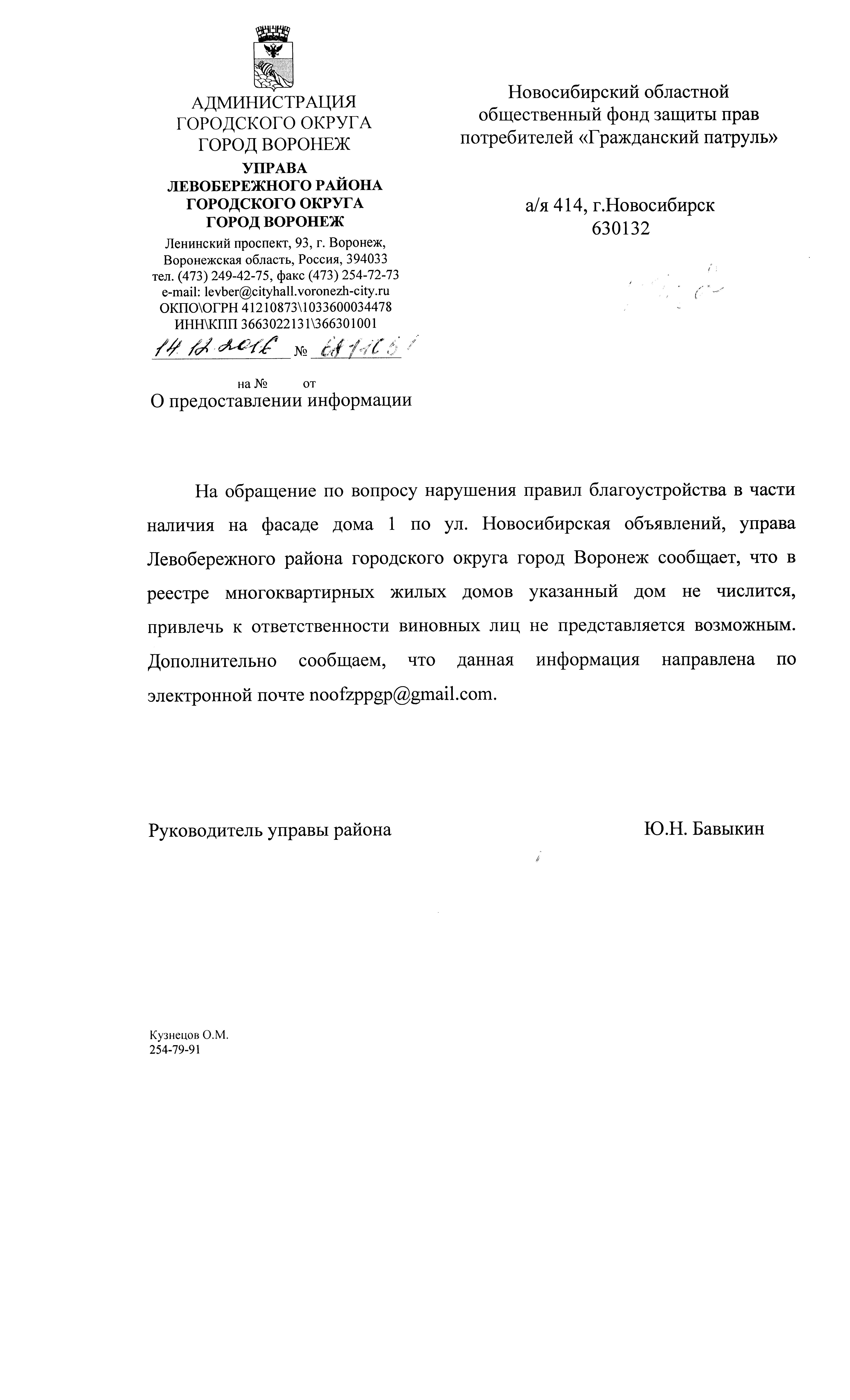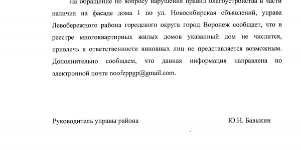 Номер жалобы:11834 Тип жалобы:Иные проблемы ЖКХ Название объекта:Мэрия Регион:Воронежская область Город:Воронеж Адрес:ул. Свободы, 59 Описание жалобы:Надписи Статус: