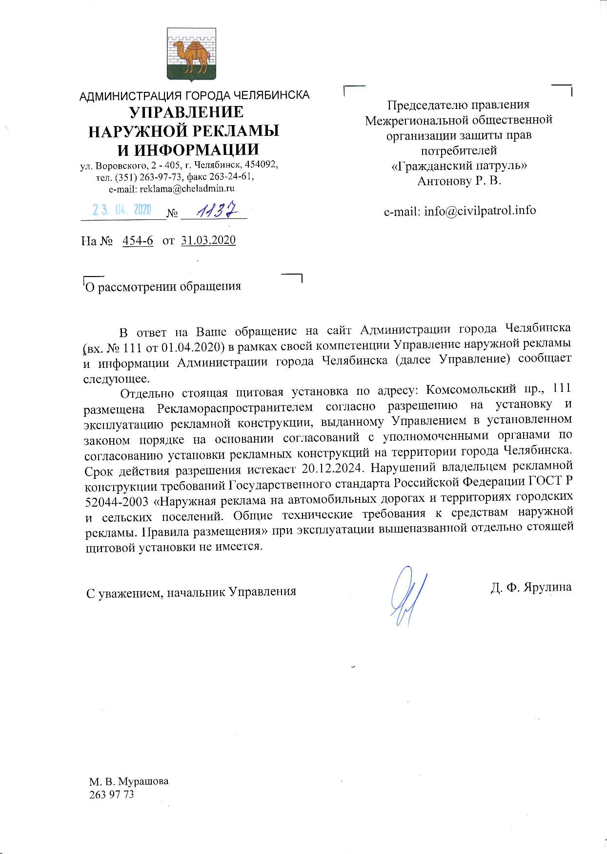 Номер жалобы:64991 Тип жалобы:Прочее Название объекта:Администрация г.Челябинска Регион:Челябинская область Город:Челябинск Адрес:Комсомольский проспект, 111 Описание жалобы:В районе дома 111 по Комсомольскому проспекту расположен рекламный щит.