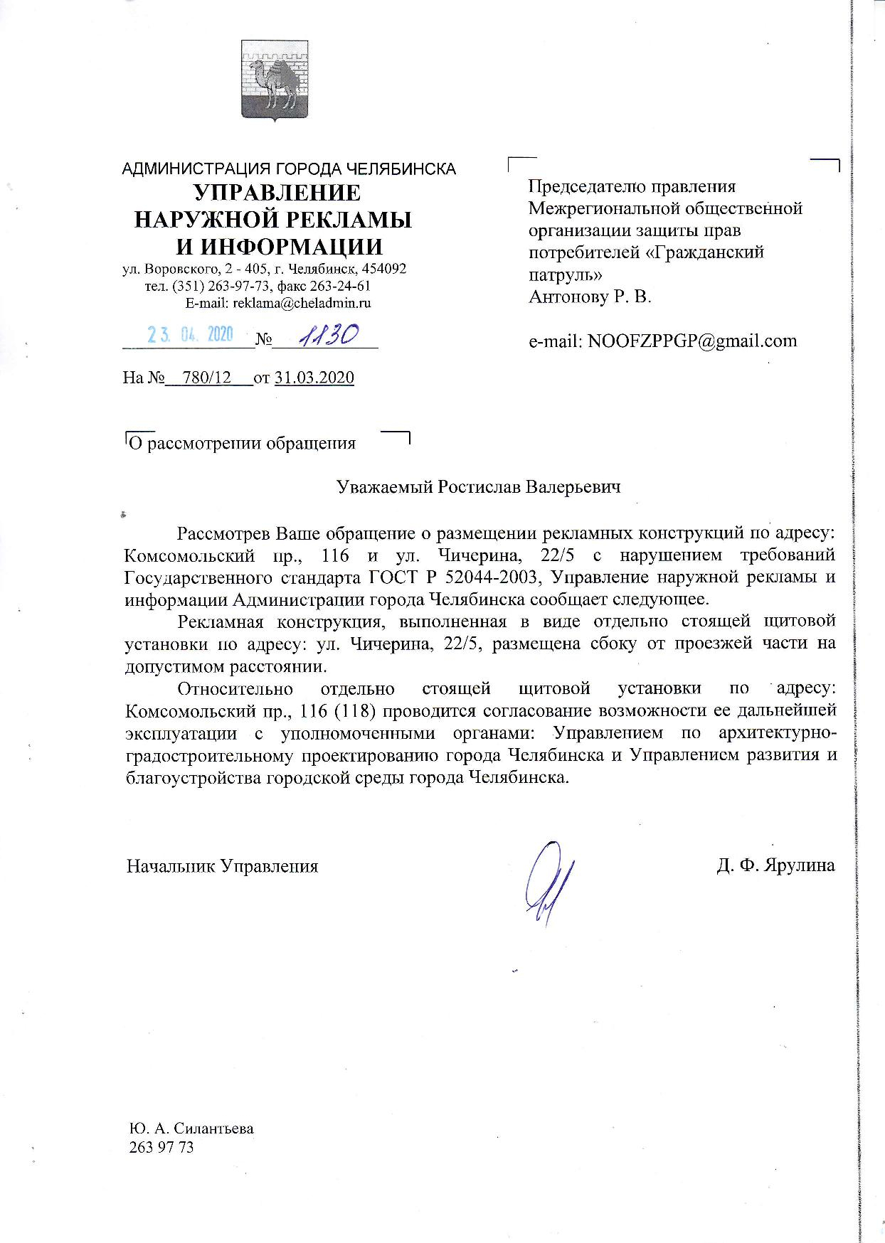 Номер жалобы:64993 Тип жалобы:Прочее Название объекта:Администрация г.Челябинска Регион:Челябинская область Город:Челябинск Адрес:Комсомольский проспект, 116 Описание жалобы:В районе домов 116 по Комсомольскому проспекту и дома 22/5 по ул.Чичерина расположены 2 (два) рекламных щита.