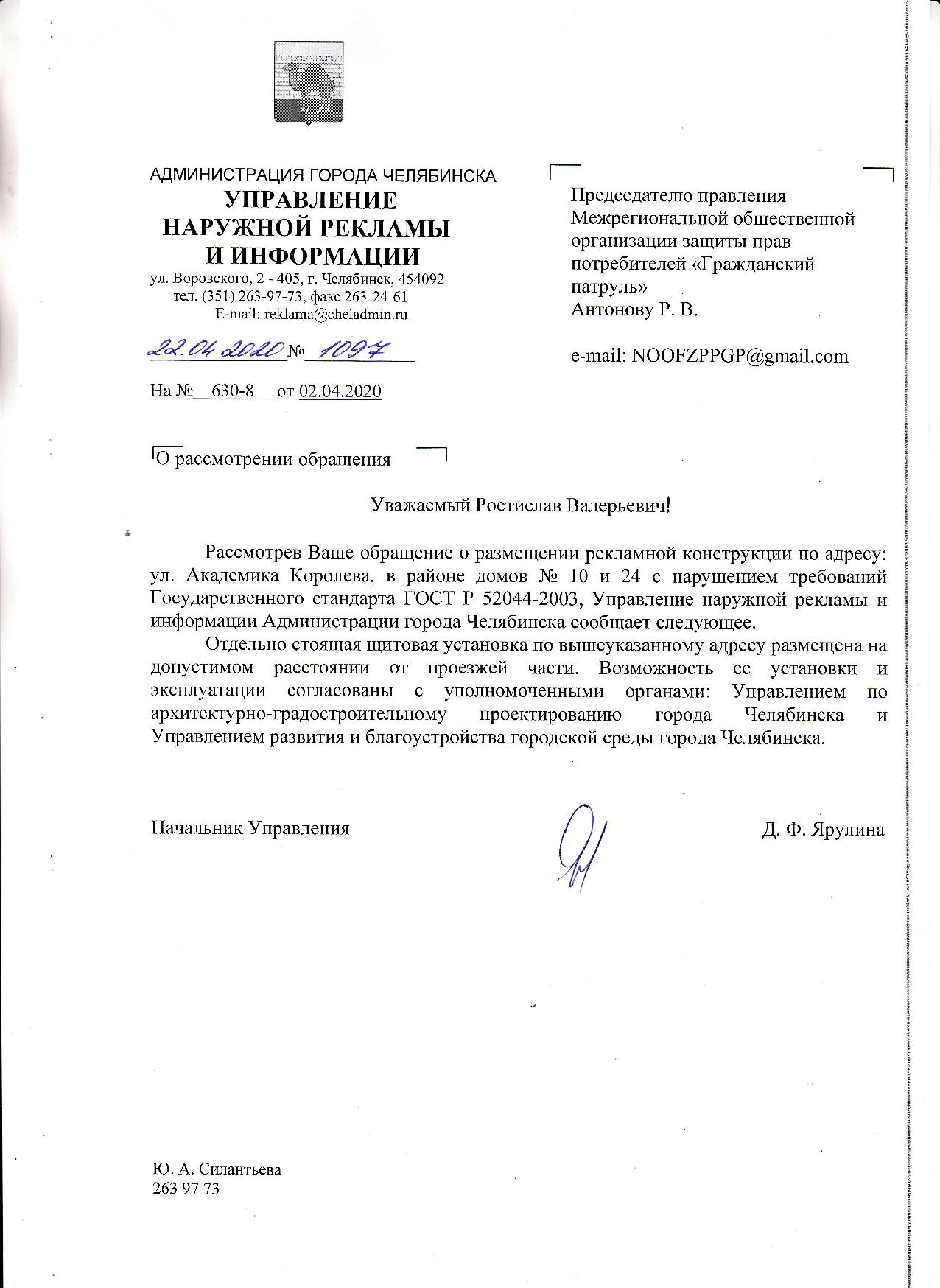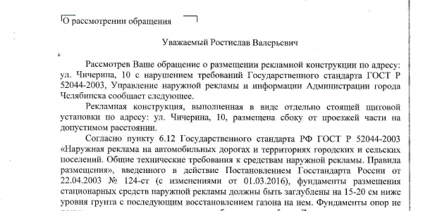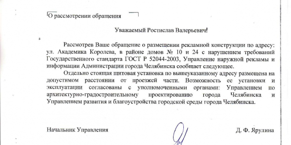 Номер жалобы:65063 Тип жалобы:Прочее Название объекта: Регион:Челябинская область Город:Челябинск Адрес:улица Академика Королёва Описание жалобы:В районе домов 10 и 24 по ул.Ак.Королева установлен рекламный щит. Прошу проверить законность размещения щита согласно правилам, нормативам и стандартам, в том числе и перечню разрешений на установку и эксплуатацию рекламных конструкций от 17.01.2020 г. В случае нарушения и несоответствия нормативным документам прошу произвести демонтаж конструкции рекламного щита и указать сроки. Статус: