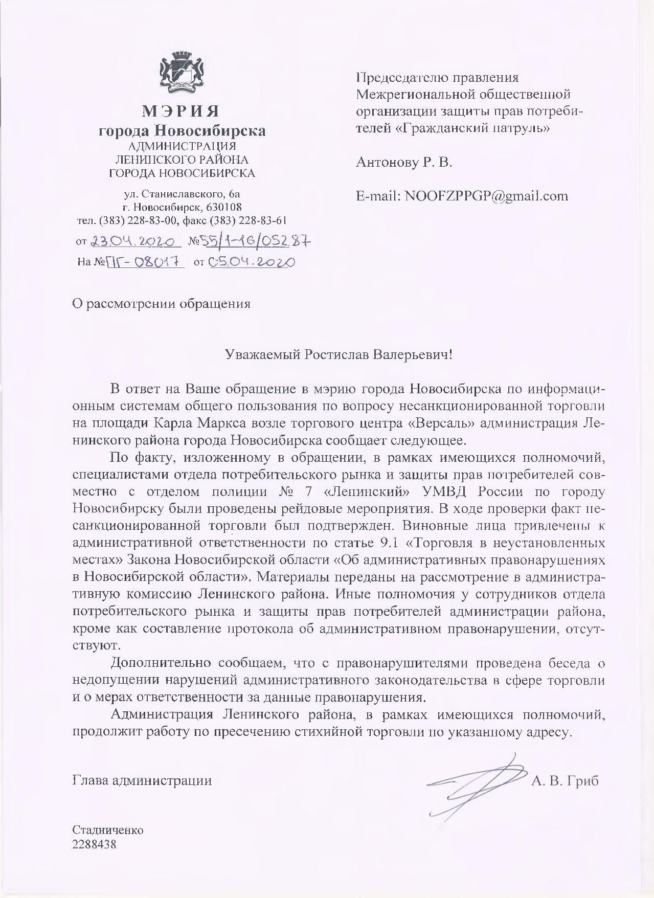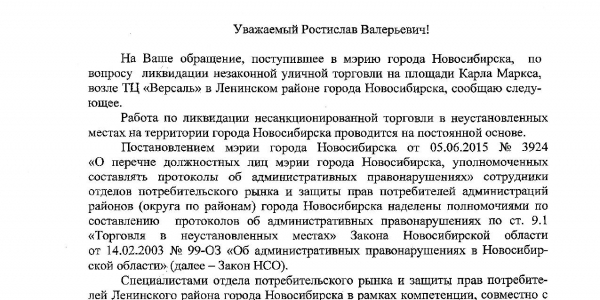 Номер жалобы:65108 Тип жалобы:Прочее Название объекта: Регион:Новосибирская область Город:Новосибирск Адрес:площадь Карла Маркса Описание жалобы:Бездействие сотрудников полиции на предмет незаконной торговли на пл Маркса. Тц Версаль. Статус: