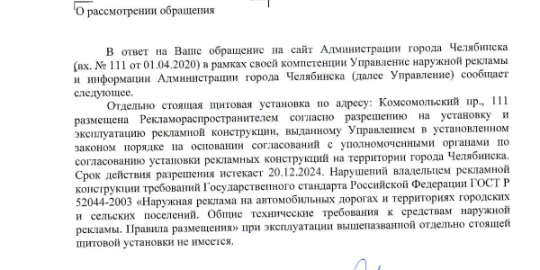 Прошу проверить законность размещения щита согласно правилам, нормативам и стандартам, в том числе и перечню разрешений на установку и эксплуатацию рекламных конструкций от 17.01.2020 г.
