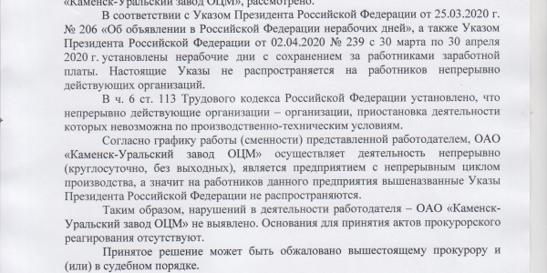 Номер жалобы:65061 Тип жалобы:Прочее Название объекта: Регион:Свердловская область Город:Каменск-Уральский Адрес:Синарский район Описание жалобы:Здравствуйте, актуальная жалоба на несоблюдение президентского указа о нерабочей неделе.