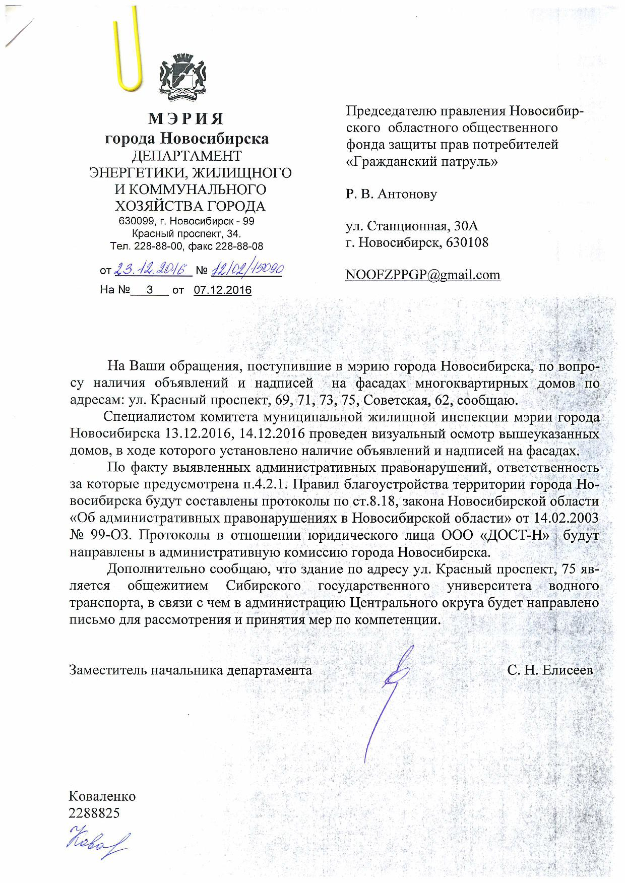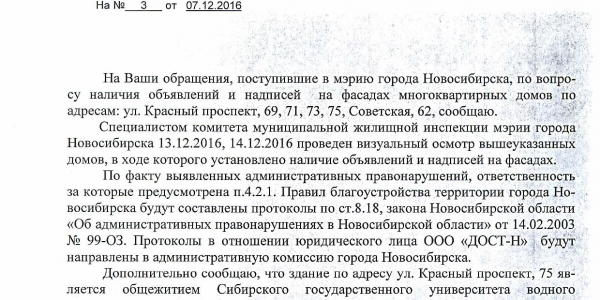 Номер жалобы:11614 Тип жалобы:Иные проблемы ЖКХ Название объекта:Управляющая Компания Город:Новосибирск Адрес:Новосибирск, Красный проспект, 71 Описание жалобы:Объявление в неположенном месте Статус: