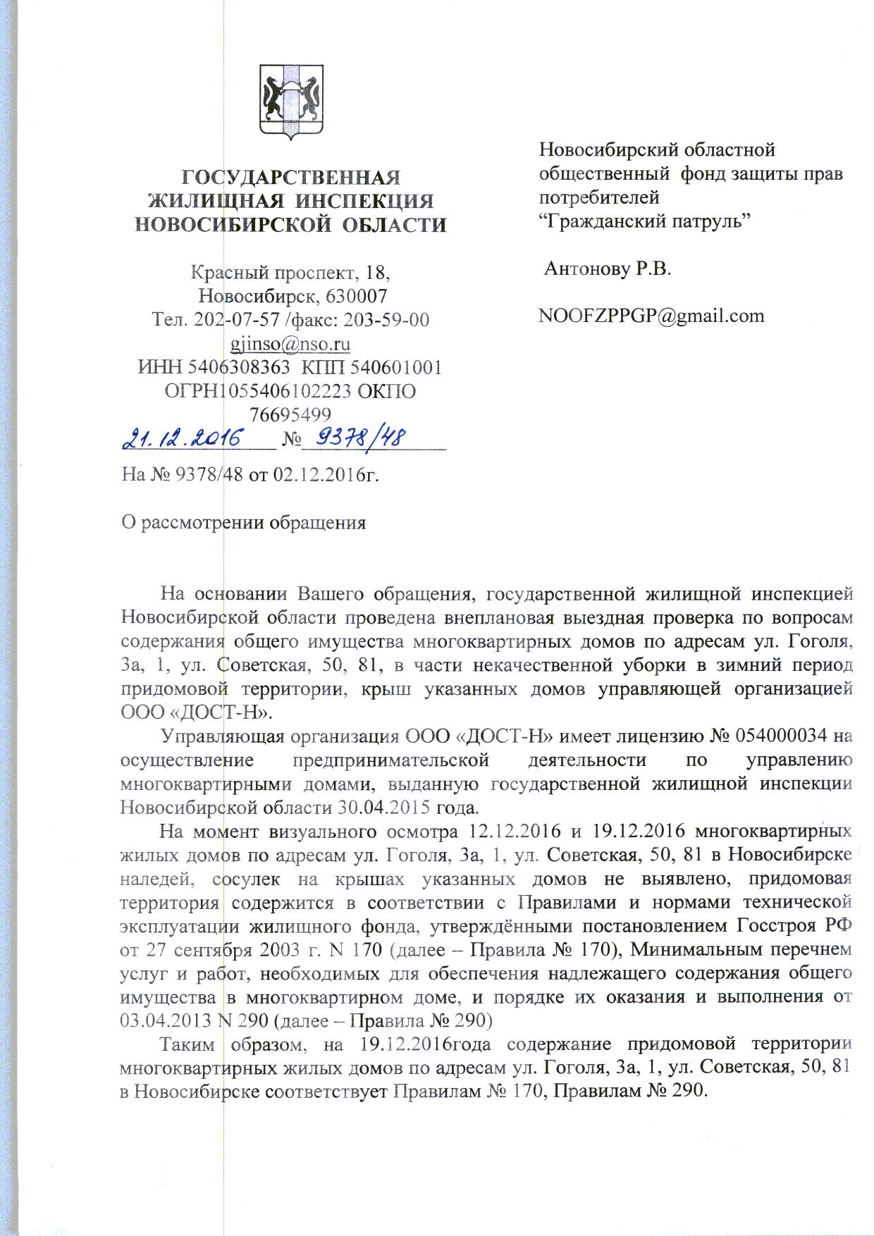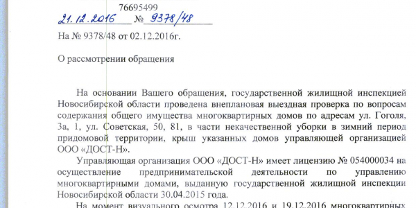 Номер жалобы:11509 Тип жалобы:Иные проблемы ЖКХ Название объекта:Управляющая Компания Город:Новосибирск Адрес:Новосибирск, улица Советская, 44 Описание жалобы:Снег на крыше дома советская 44 Статус: