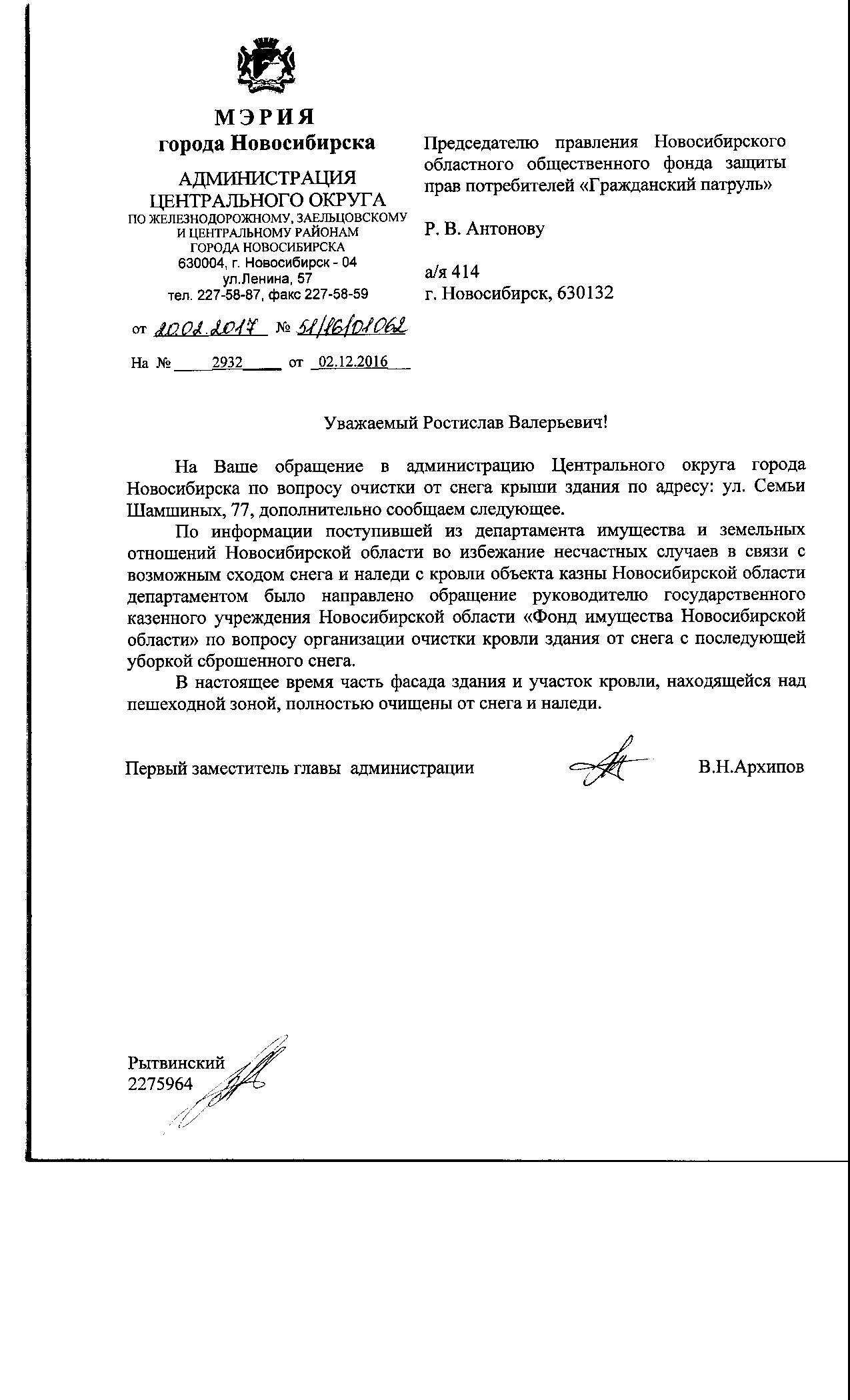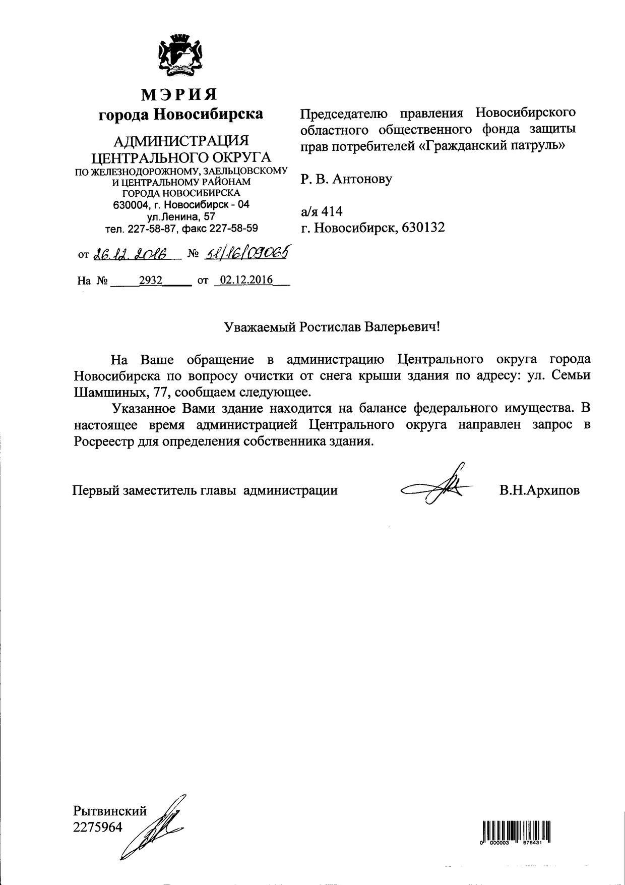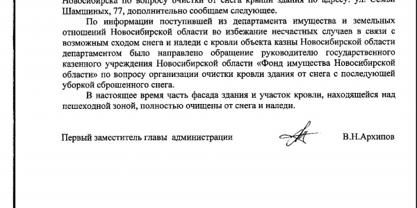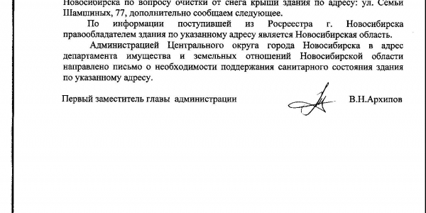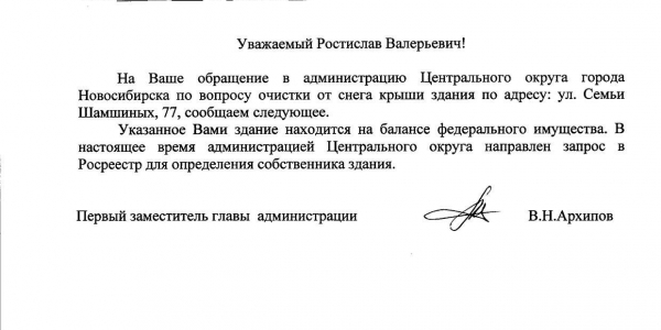 Номер жалобы:11465 Тип жалобы:Иные проблемы ЖКХ Название объекта:Управляющая Компания Город:Новосибирск Адрес:Новосибирск, улица Семьи Шамшиных, 77 Описание жалобы:Много снега на крыше дома Статус: