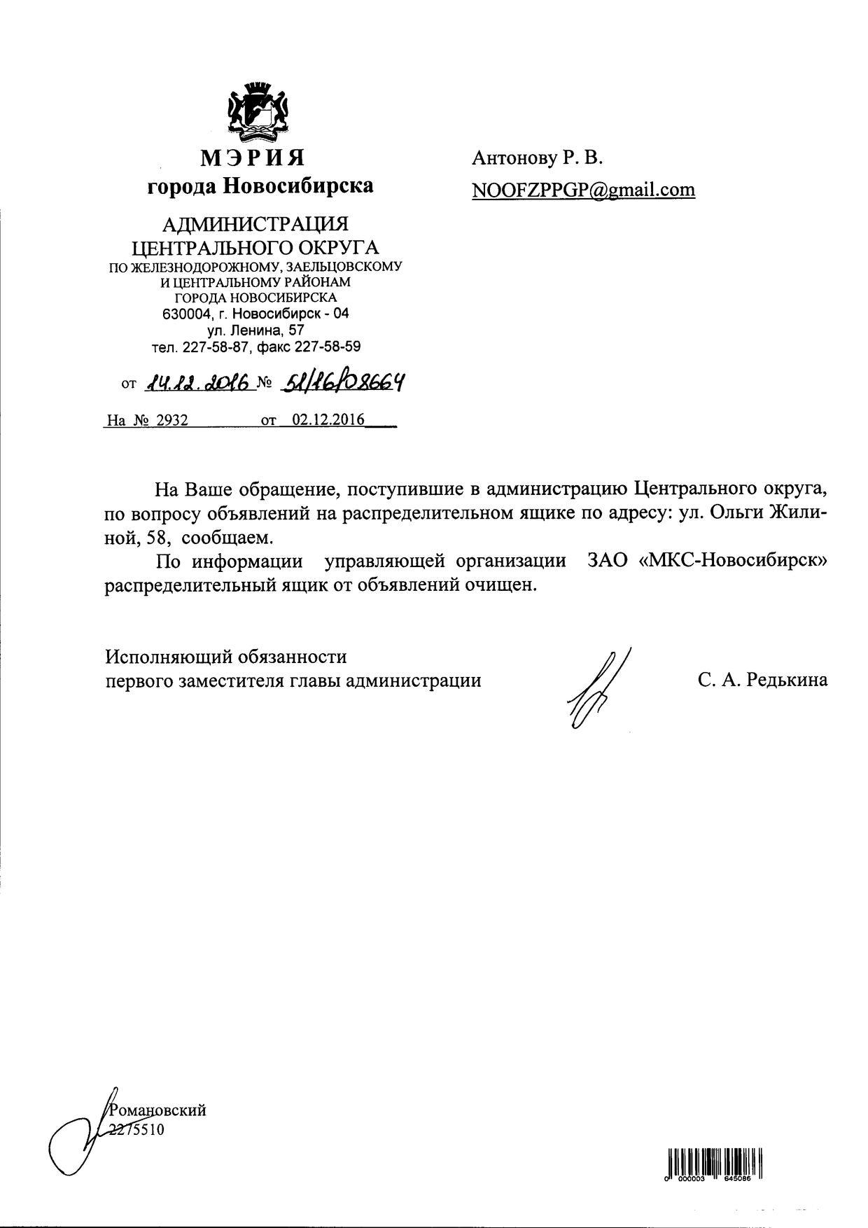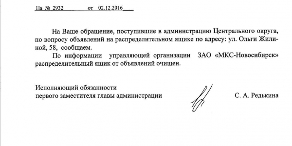 Номер жалобы:11461 Тип жалобы:Иные проблемы ЖКХ Название объекта:Управляющая Компания Город:Новосибирск Адрес:Новосибирск, улица Ольги Жилиной, 58 Описание жалобы:ОбъЯвление в неположенном месте Статус: