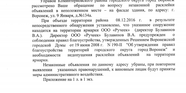 Номер жалобы:11473 Тип жалобы:Иные проблемы ЖКХ Название объекта:Общественная Организация Регион:Воронежская область Город:Воронеж Адрес:ул. 9-го Января, 134А Описание жалобы:Наклейка объявлений в неправильном месте. Статус: