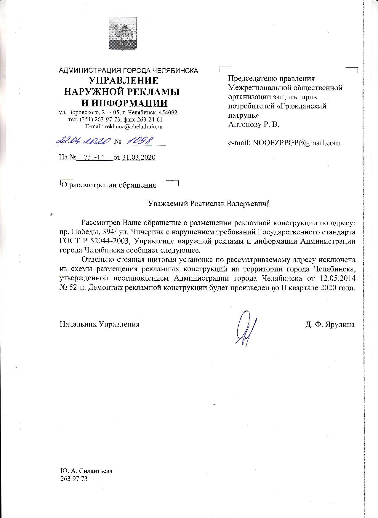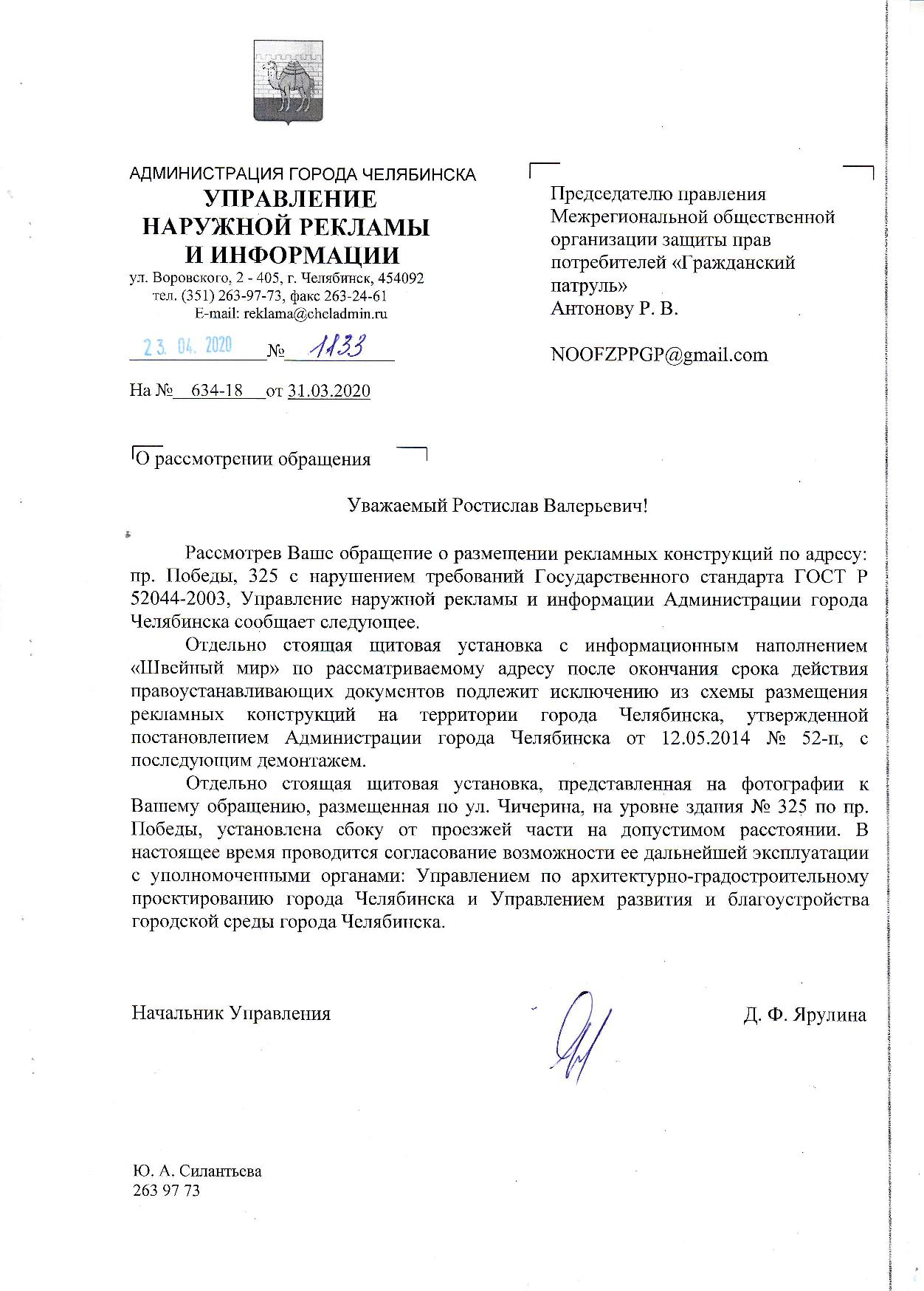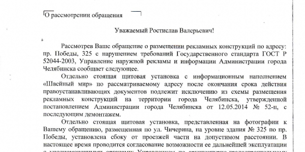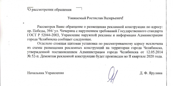 Номер жалобы:64986 Тип жалобы:Прочее Название объекта:Администрация г.Челябинска Регион:Челябинская область Город:Челябинск Адрес:проспект Победы, 394 Описание жалобы:В районе дома 394 по ул.Пр.Победы (со стороны улицы Чичерина) расположен рекламный щит.