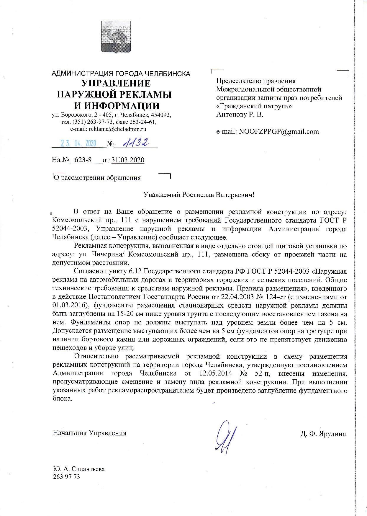 Номер жалобы:64987 Тип жалобы:Прочее Название объекта:Администрация г.Челябинска Регион:Челябинская область Город:Челябинск Адрес:Комсомольский проспект, 111 Описание жалобы:В районе домов 13 по ул.Чичерина и Комсомольского проспекта дом 111 расположен рекламный щит.