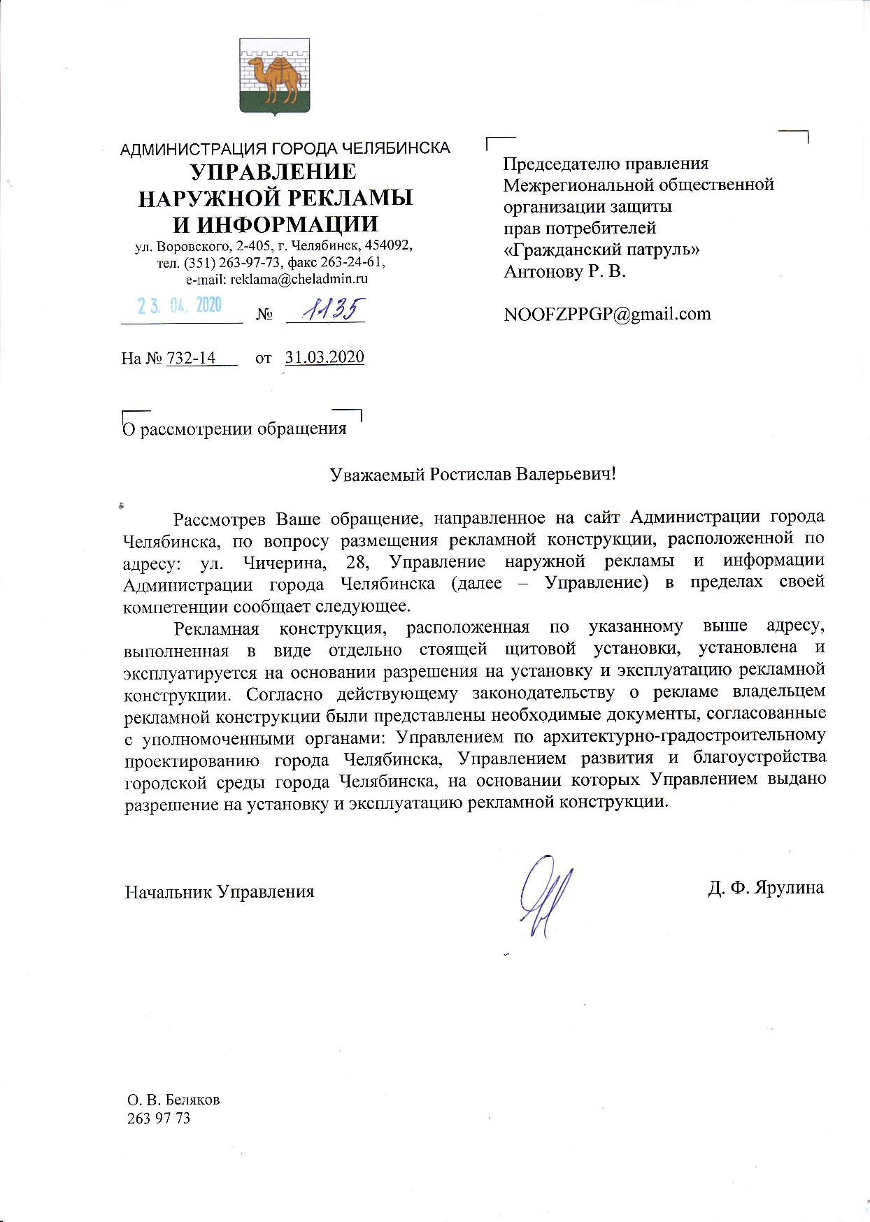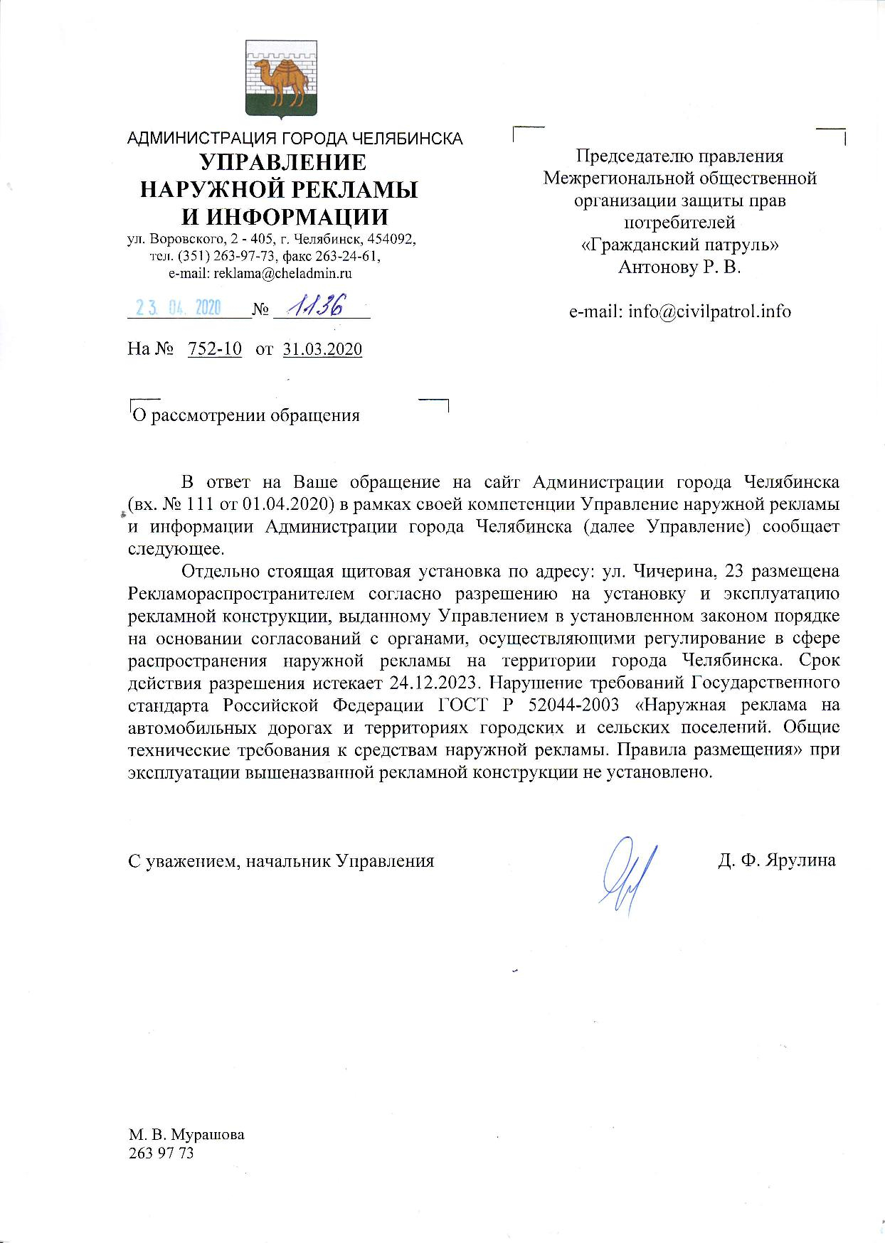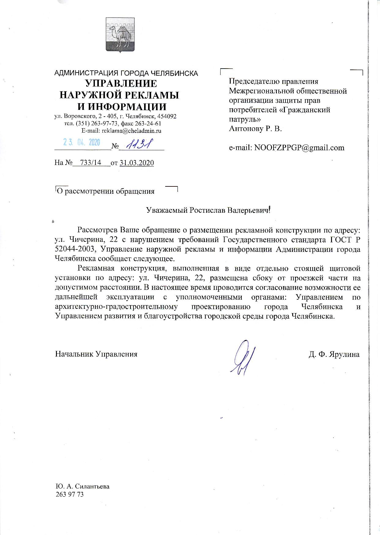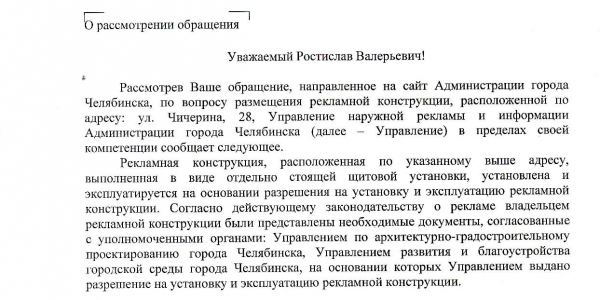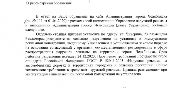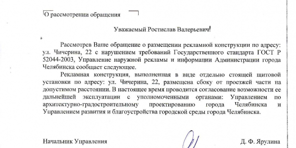 Номер жалобы:64988 Тип жалобы:Прочее Название объекта:Администрация г.Челябинска Регион:Челябинская область Город:Челябинск Адрес:улица Чичерина, 22 Описание жалобы:В районе дома 22 по ул.Чичерина (в районе АЗС «Газпром») расположен рекламный щит.