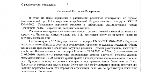 В случае нарушения и несоответствия нормативным документам прошу произвести демонтаж конструкции рекламных щитов и указать сроки.