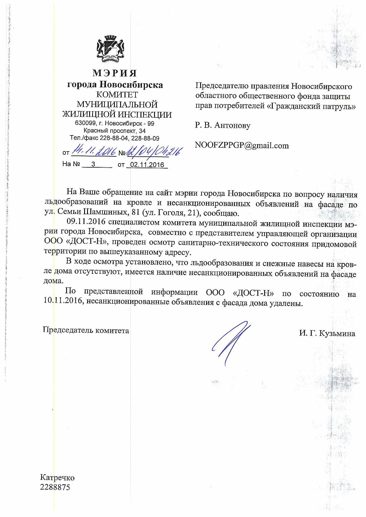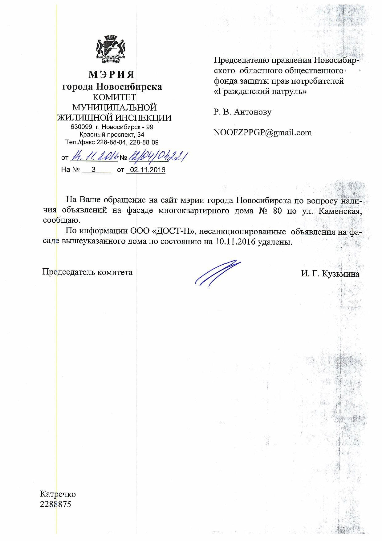 Номер жалобы:10533 Тип жалобы:Иные проблемы ЖКХ Название объекта:Управляющая Компания Город:Новосибирск Адрес:Новосибирск, улица Гоголя, 19А Описание жалобы:объявления в неположенном месте Статус: