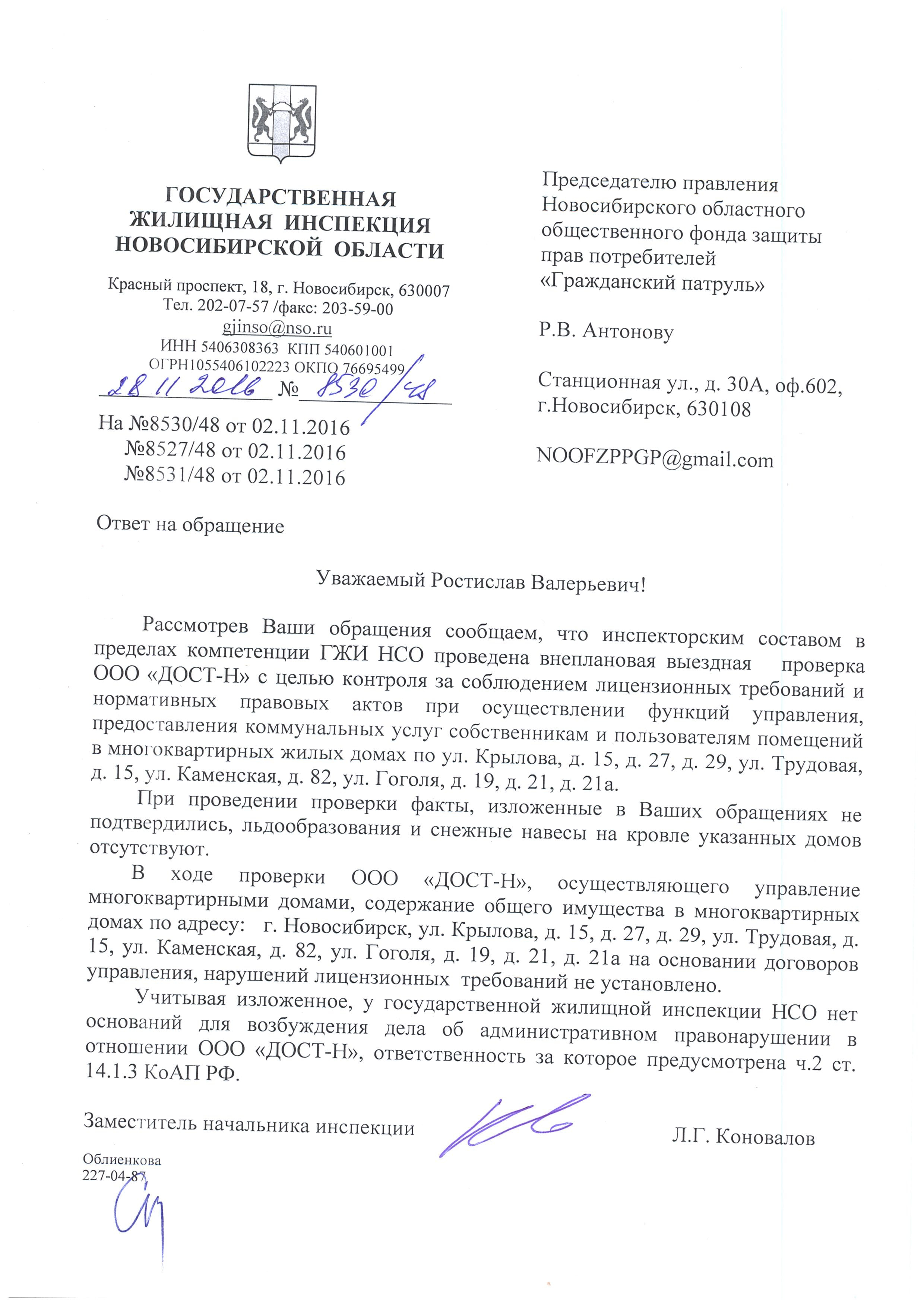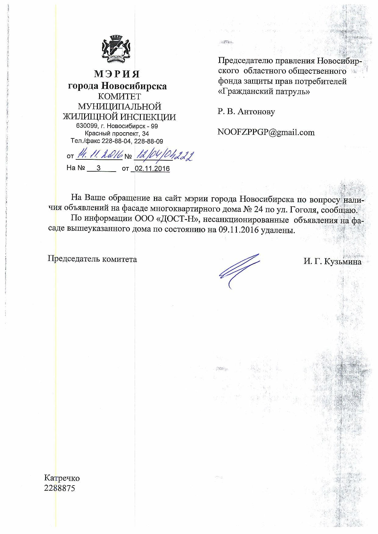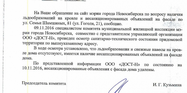 Номер жалобы:10523 Тип жалобы:Иные проблемы ЖКХ Название объекта: Регион:Новосибирская область Город:Новосибирск Адрес:улица Гоголя, 24 Описание жалобы:Объявления в неположенном месте Статус: