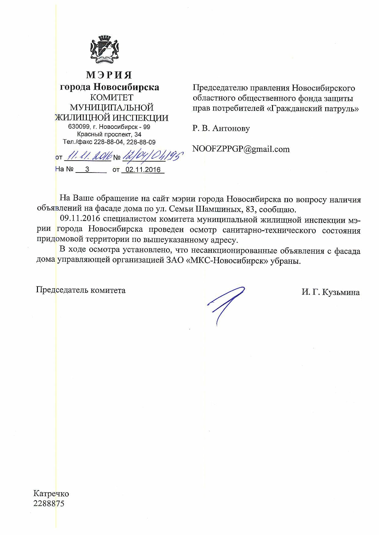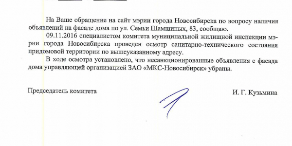 Номер жалобы:10530 Тип жалобы:Иные проблемы ЖКХ Название объекта:Управляющая Компания Город:Новосибирск Адрес:Новосибирск, улица Семьи Шамшиных, 83 Описание жалобы:Объявления в неположенном месте Статус: