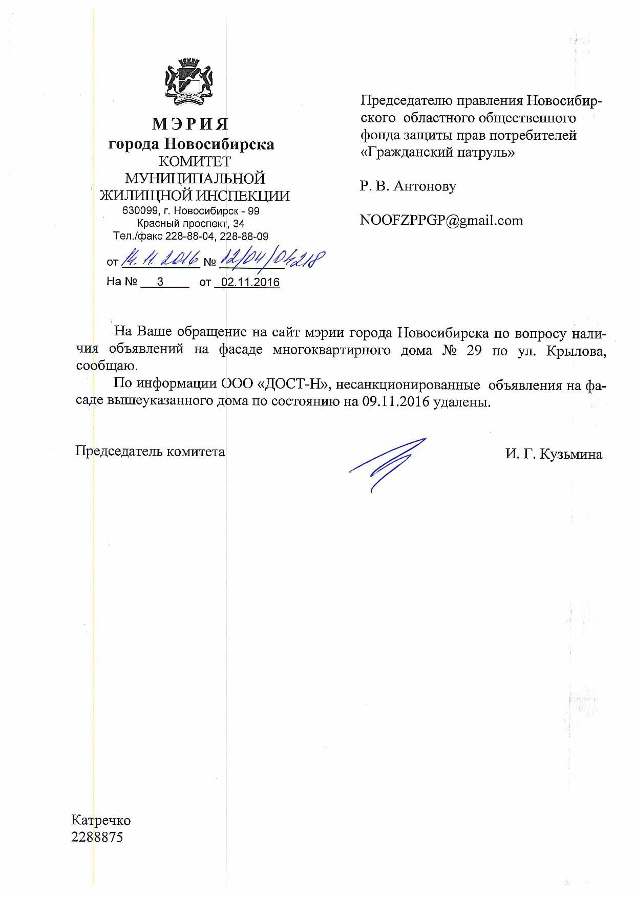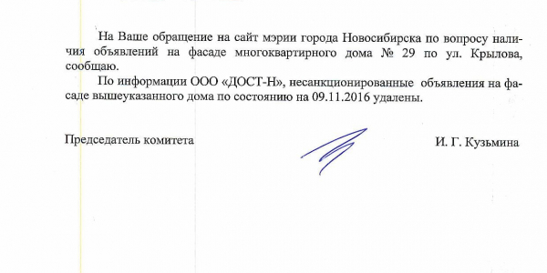 Номер жалобы:10514 Тип жалобы:Иные проблемы ЖКХ Название объекта:Управляющая Компания Город:Новосибирск Адрес:Новосибирск, улица Крылова, 29 Описание жалобы:Объявления на водостоке Статус: