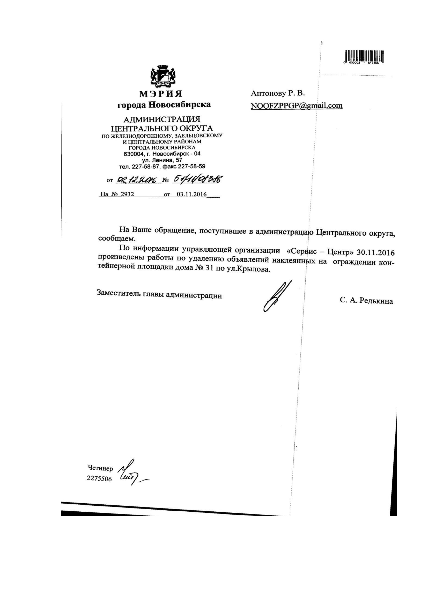 Номер жалобы:10512 Тип жалобы:Иные проблемы ЖКХ Название объекта:Управляющая Компания Город:Новосибирск Адрес:Новосибирск, улица Крылова, 29 Описание жалобы:Объявления на заборе Статус: