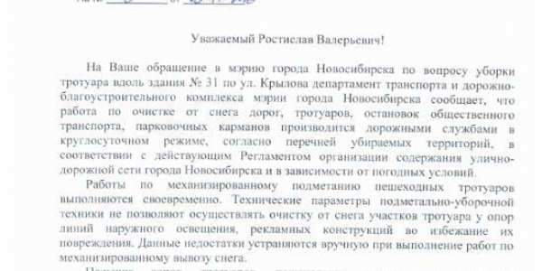 Номер жалобы:10508 Тип жалобы:Иные проблемы ЖКХ Название объекта:Управляющая Компания Город:Новосибирск Адрес:Новосибирск, улица Крылова, 31 Описание жалобы:Скользкий тротуар Статус: